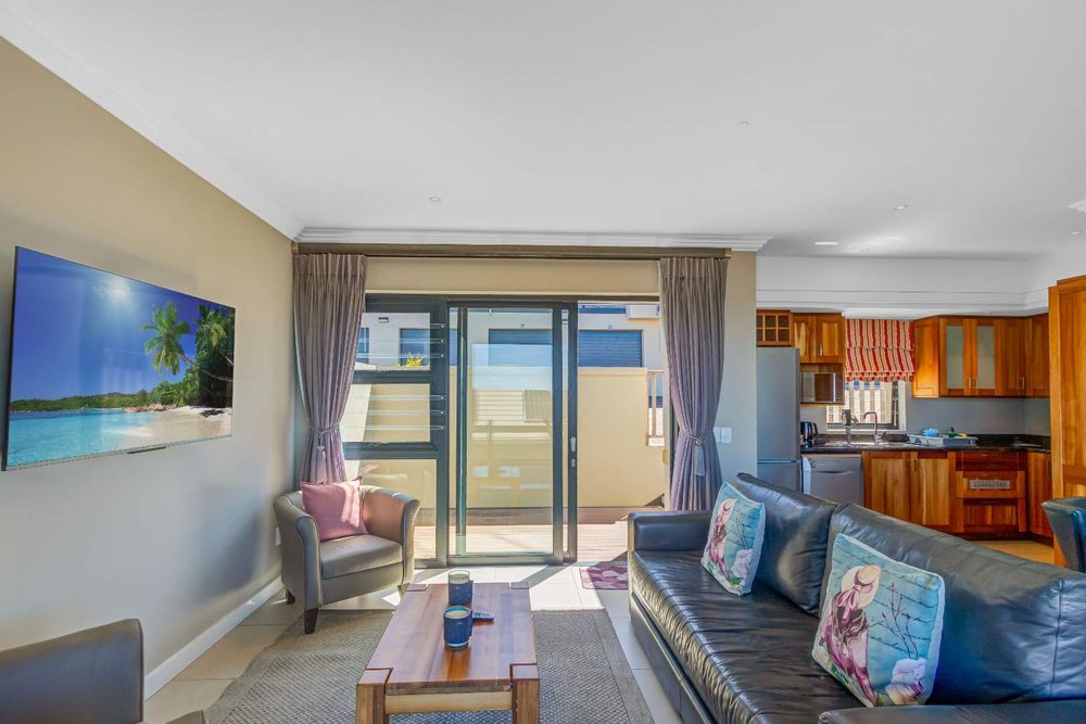 The open-plan living area flows onto a protected deck with full louvre and canvas enclosure, creating a comfortable all-weather outdoor space ideal for year-round enjoyment. From here, you can enjoy a partial sea view stretching towards Buffels Bay, adding to the relaxed coastal ambiance.