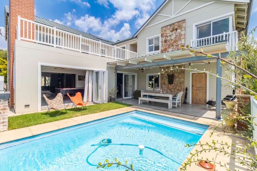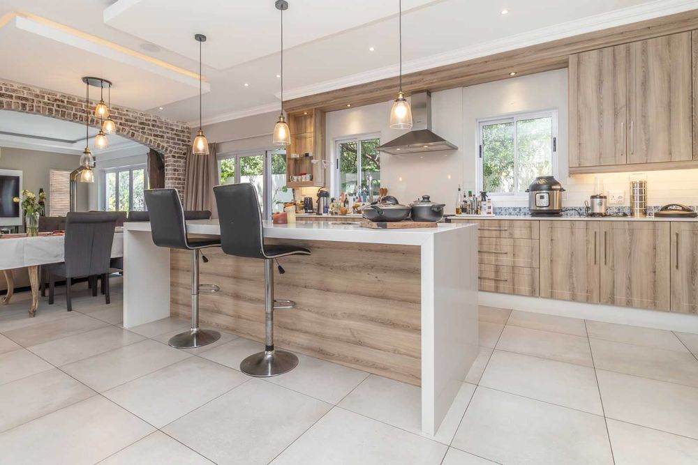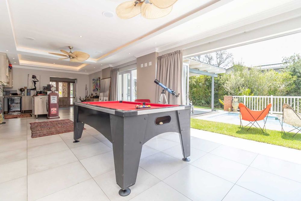 From the welcoming entrance hall, the home opens into expansive open-plan living areas that include a formal lounge complete with air conditioning, underfloor heating, and a Morso-style wood-burning fireplace. The adjoining dining room, contemporary built-in bar, and indoor-outdoor patio with gas braai create the perfect setting for entertaining year-round.