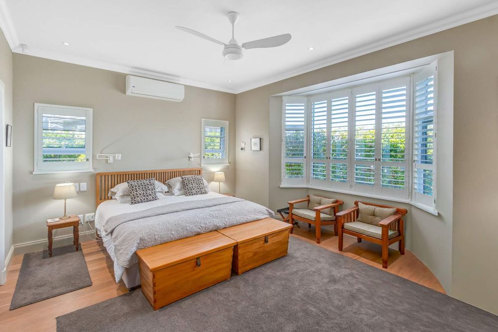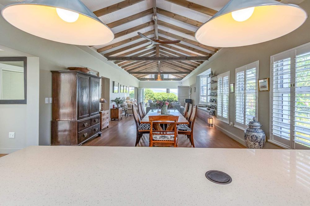 Solid white oak floors, high exposed beams and classic plantation shutters create a warm, timeless backdrop the kind of space that feels settled from the moment you walk in.