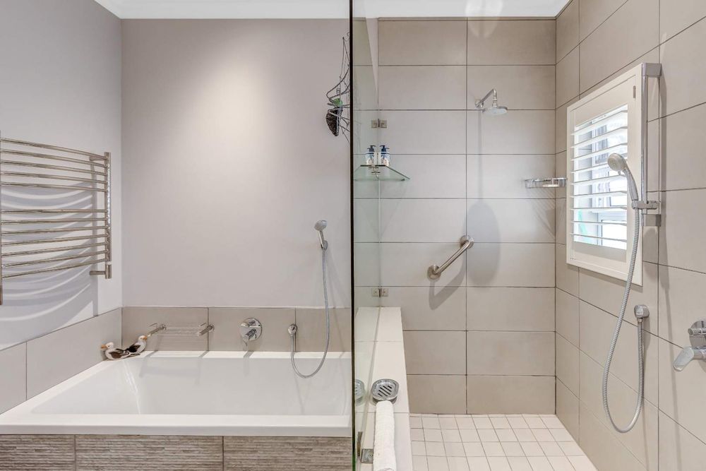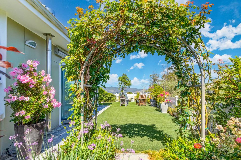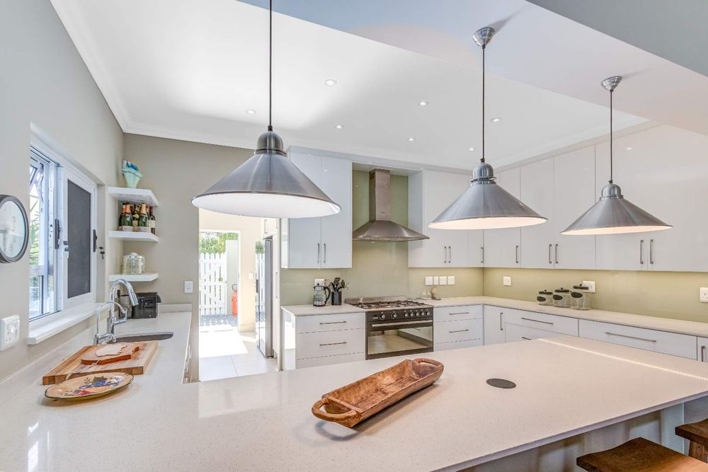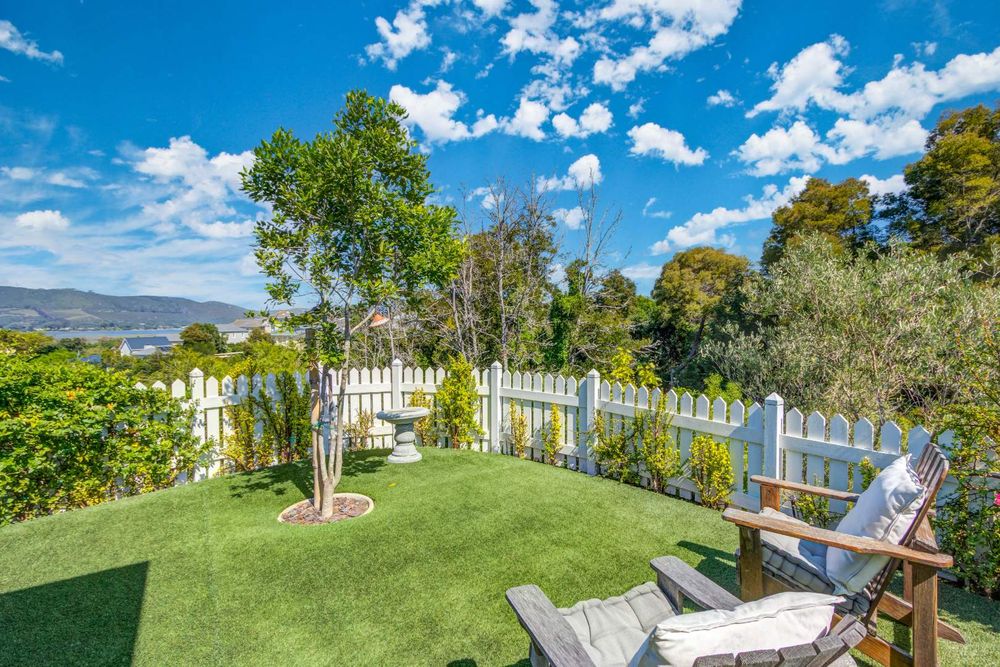 The modern kitchen with separate scullery flows easily into the living areas. At the far end, sliders open to reveal a quiet surprise: an enchanting English garden flanking a pathway that leads to a private alfresco setting with a ten-seater table. Beyond, an unspoilt forested hill rises, so synonymous with Knysna’s timber heritage. From a quiet corner in the opposite end of the garden, you have a view toward the estuary.