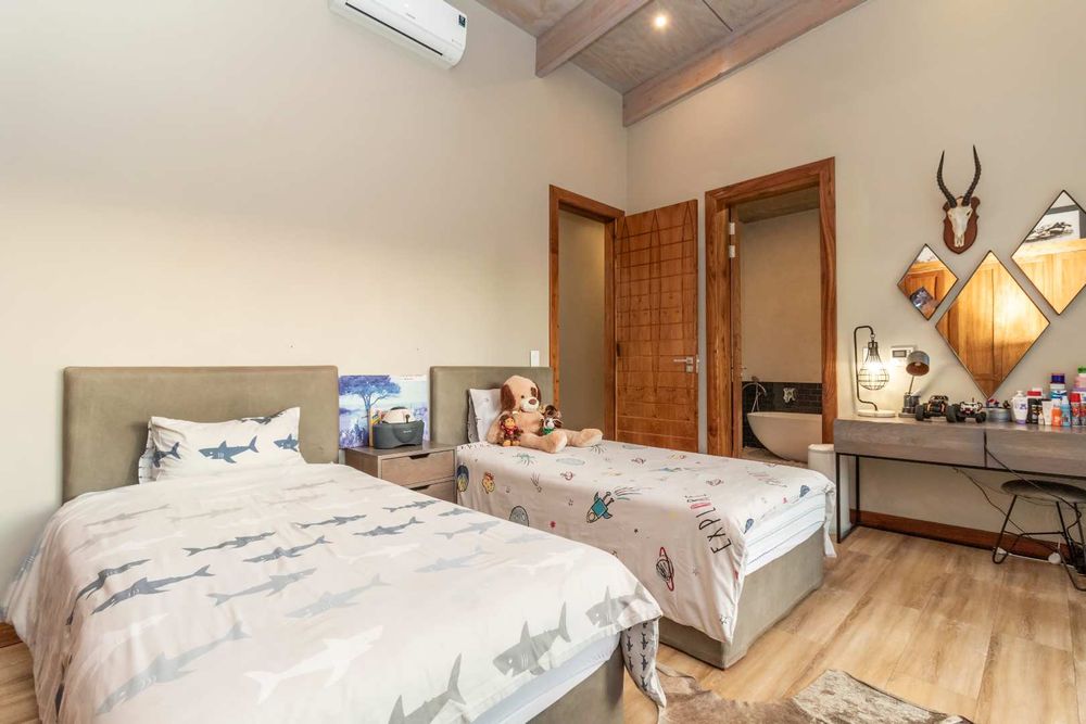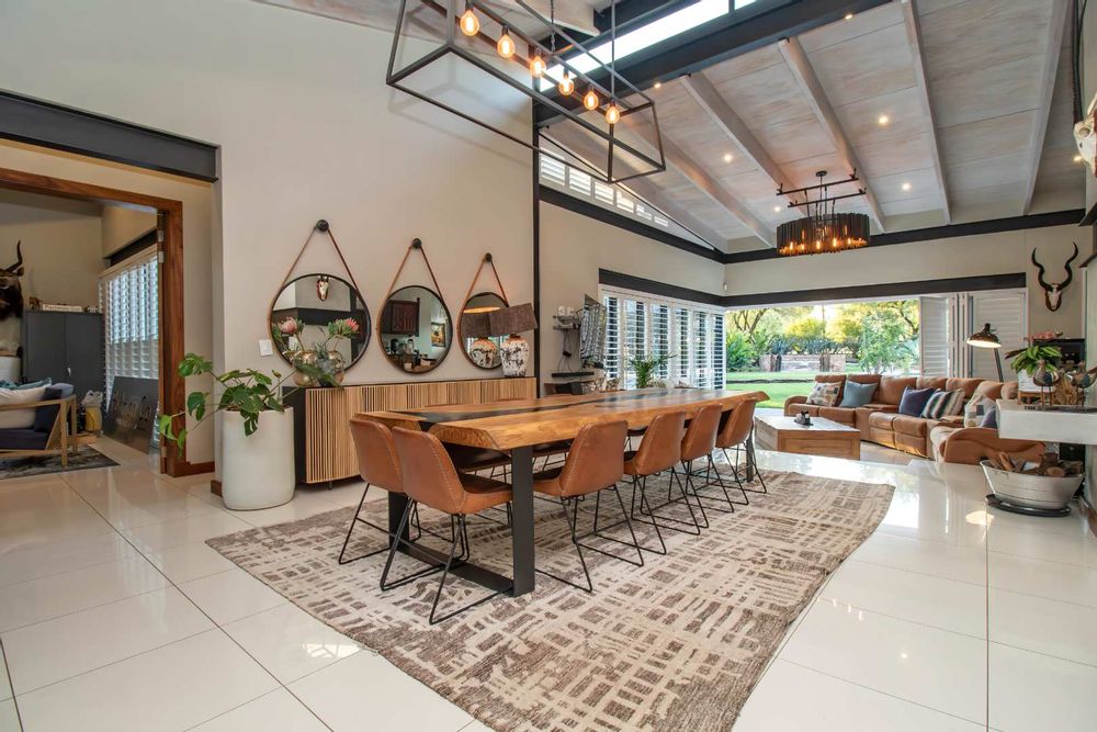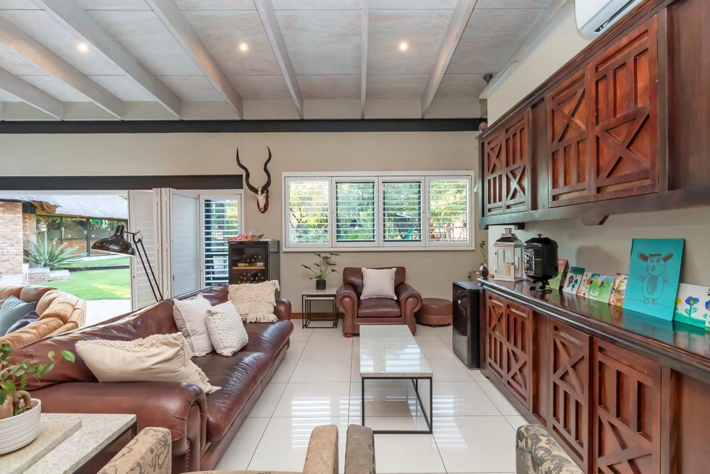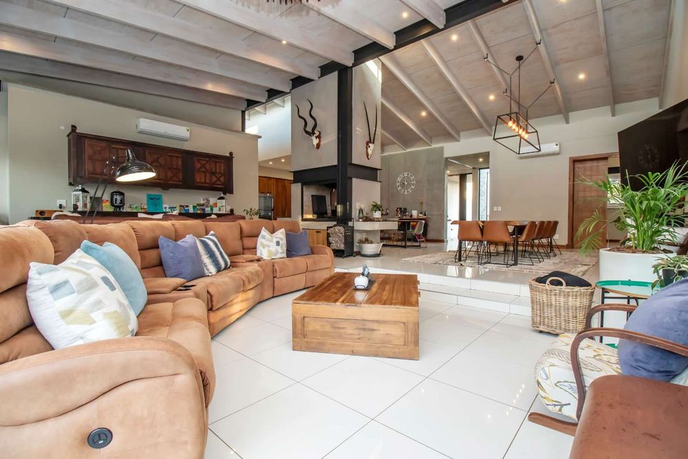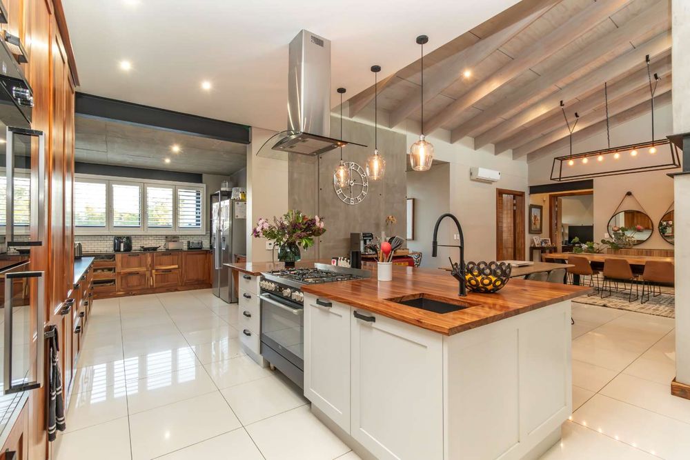 The double volume entrance lobby creates an awe inspired setting with seamless flow through to the open plan living areas which include formal and informal dining and sitting areas with central wood burning fireplace. These areas are complimented by double volume ceilings with exposed beams and invite the outside in through large stacking doors which offer beautiful views of the indigenous garden and sparkling swimming pool. The custom-made feature kitchen with separate large scullery and laundry room as well as walk in pantry is central to the living area and offers solid kiaat wood units with Caesar stone counter tops. Integrated appliances include a gas hob and oven as well as two eye level electric ovens. The living area is complimented by a separate TV lounge, also opening into the garden. A home office provides the perfect work from home space and a conveniently situated guest cloakroom enhances the living areas.