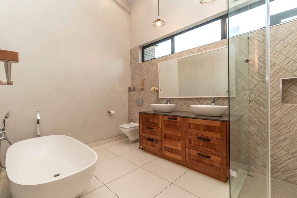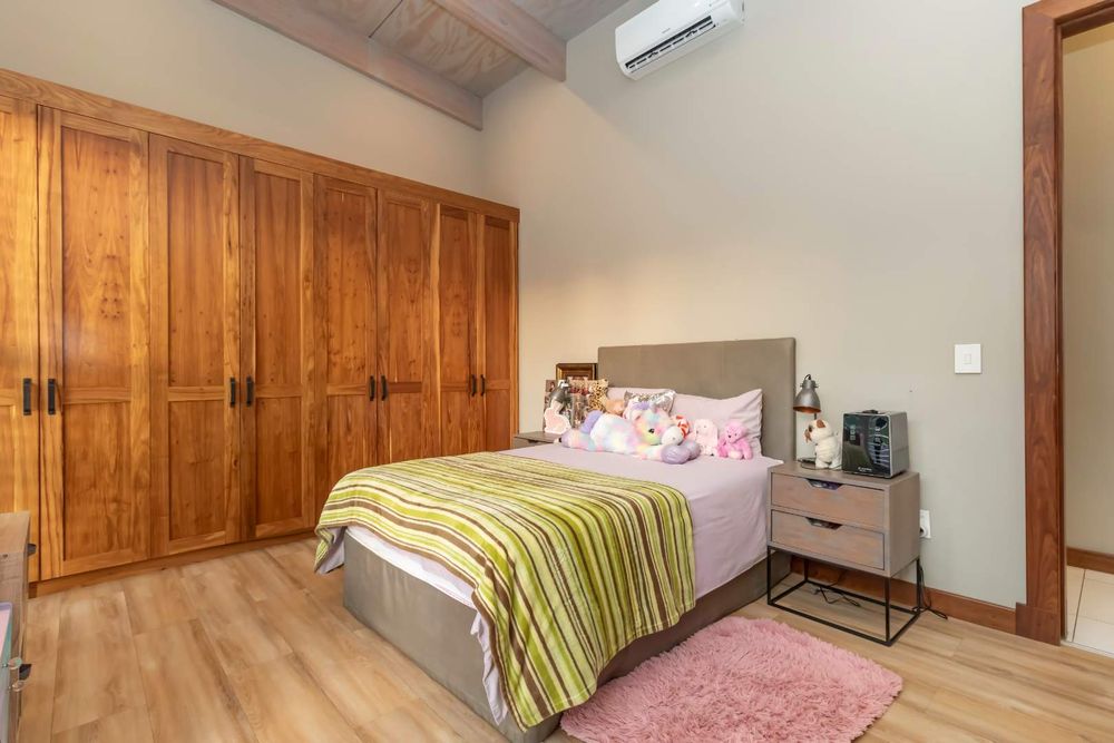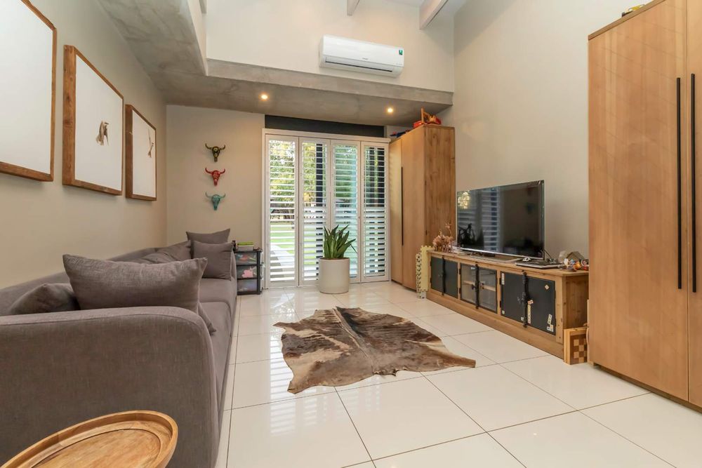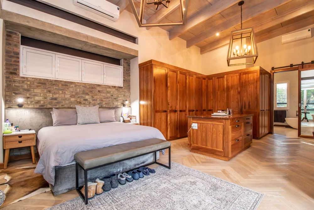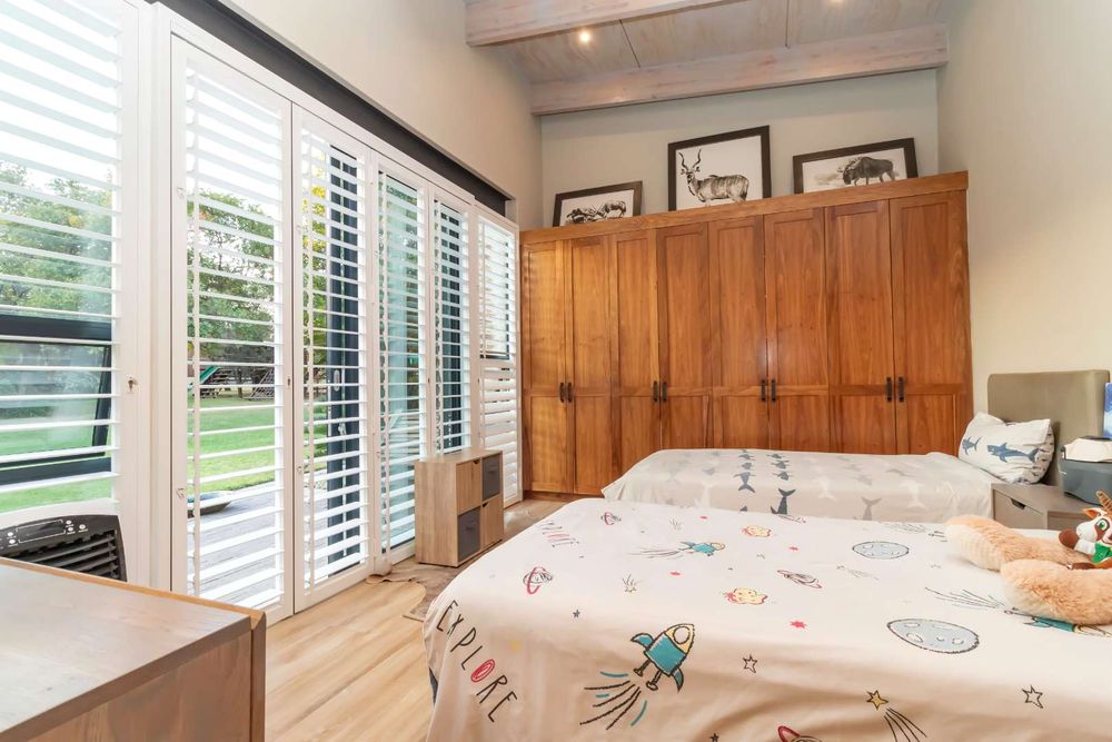 The double volume entrance lobby creates an awe inspired setting with seamless flow through to the open plan living areas which include formal and informal dining and sitting areas with central wood burning fireplace. These areas are complimented by double volume ceilings with exposed beams and invite the outside in through large stacking doors which offer beautiful views of the indigenous garden and sparkling swimming pool. The custom-made feature kitchen with separate large scullery and laundry room as well as walk in pantry is central to the living area and offers solid kiaat wood units with Caesar stone counter tops. Integrated appliances include a gas hob and oven as well as two eye level electric ovens. The living area is complimented by a separate TV lounge, also opening into the garden. A home office provides the perfect work from home space and a conveniently situated guest cloakroom enhances the living areas.