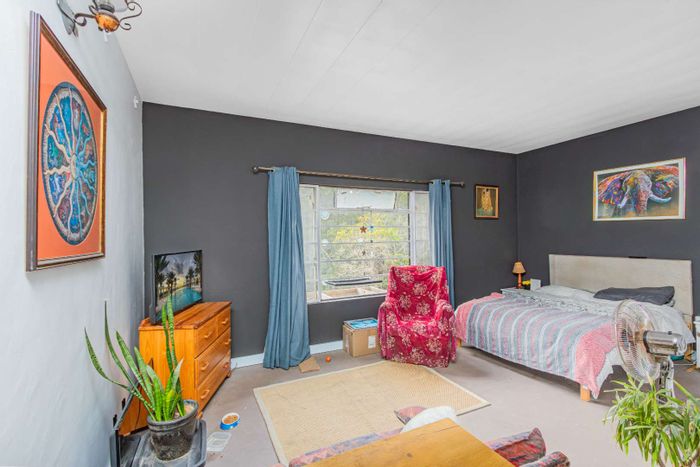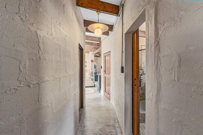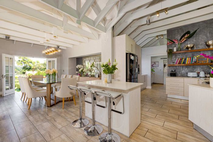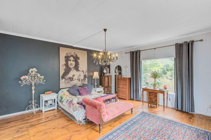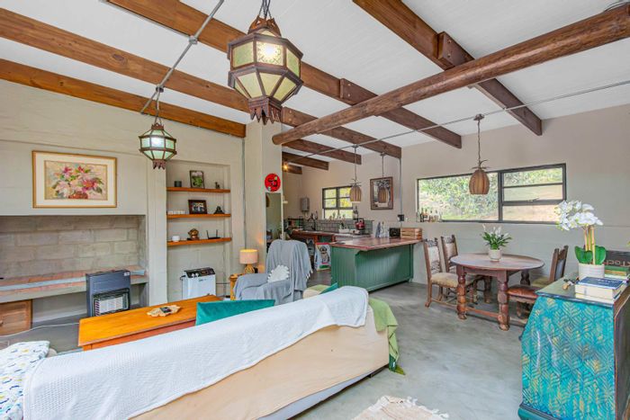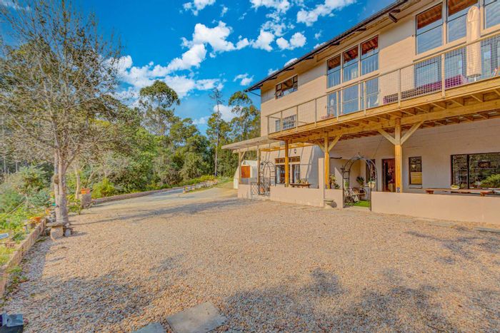 Forest-set Hoekwil smallholding, minutes from village and beaches, offers mountain views, birdsong and a seasonal stream—deck suspended among trees, family home with lofted ceilings, 4 en‑suite bedrooms plus guest dwellings.