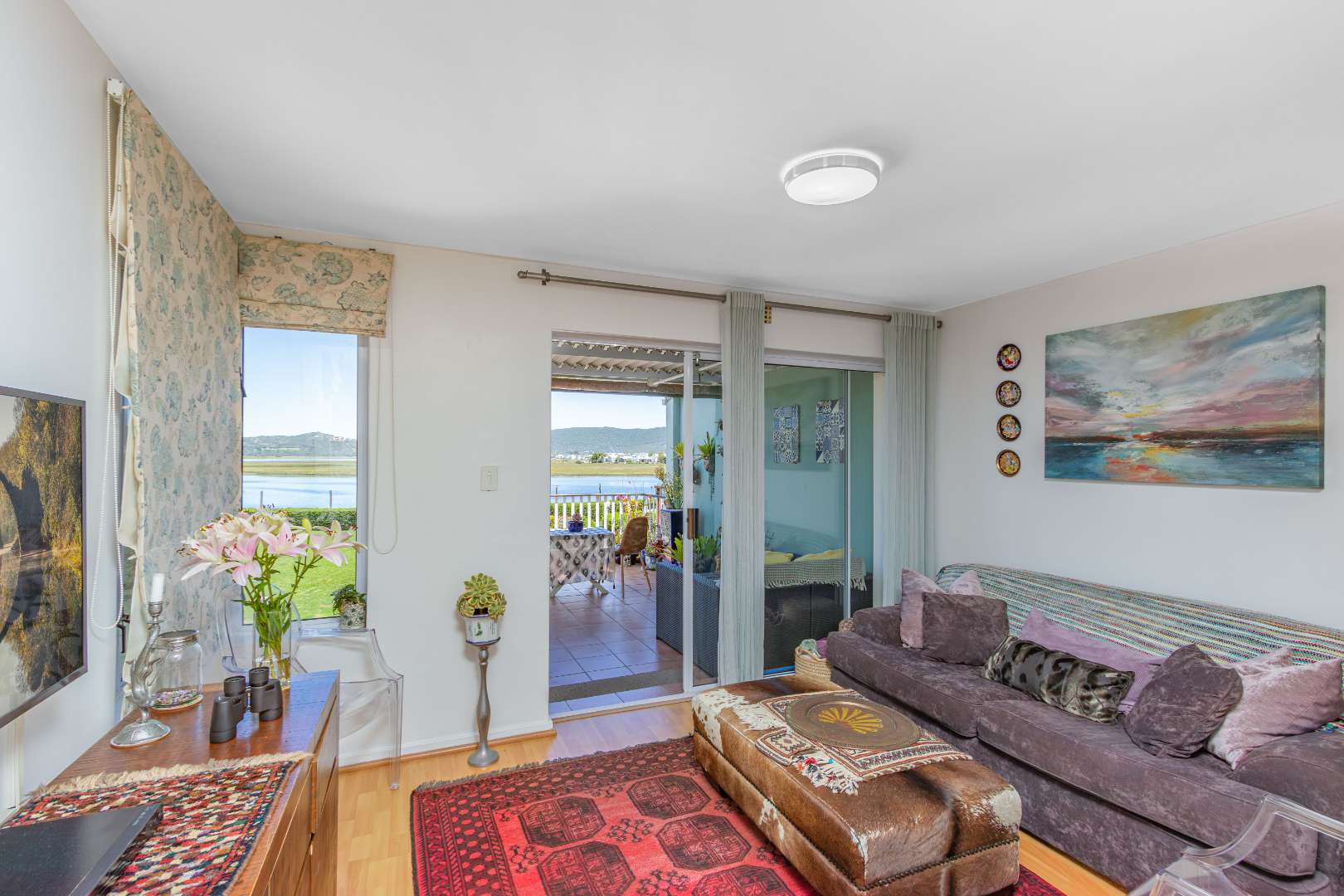 The home features ample storage throughout and a compact, functional kitchen fitted with a glass-top hob and electric oven. The living areas flow seamlessly onto a fabulous covered patio, perfectly designed for entertaining or simply soaking in the spectacular views. An additional back patio provides a sheltered outdoor space.