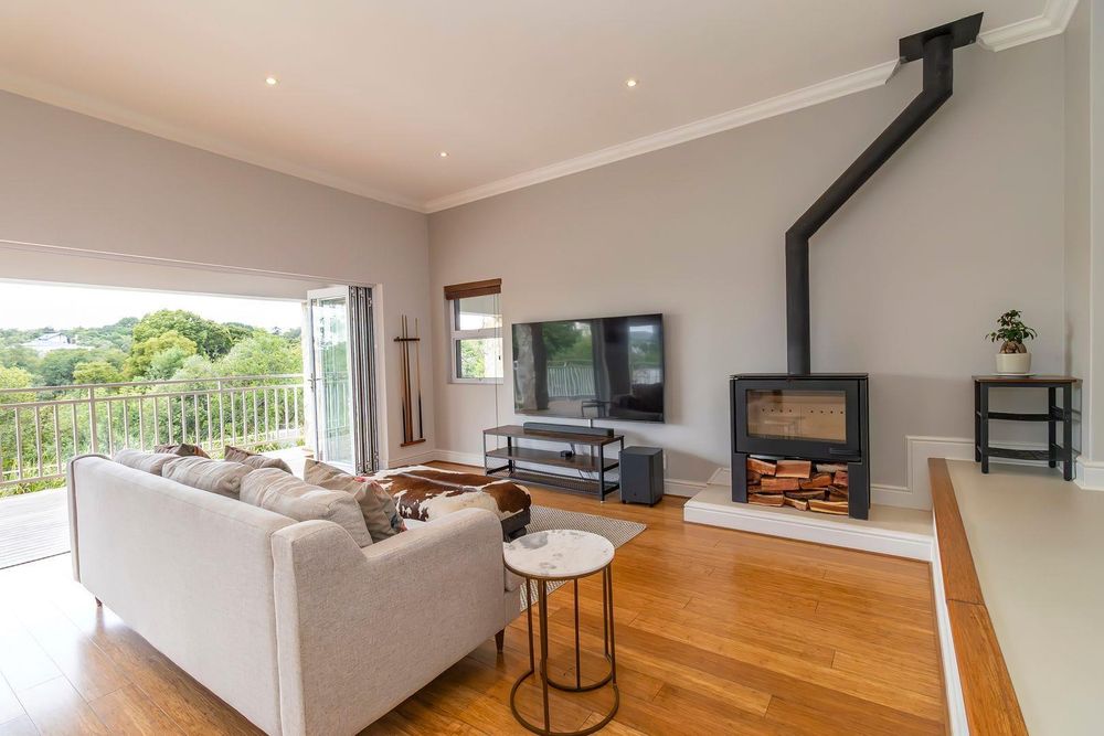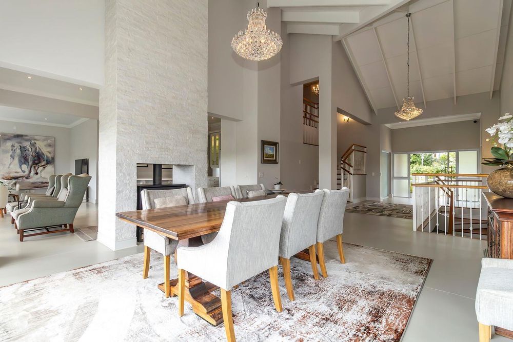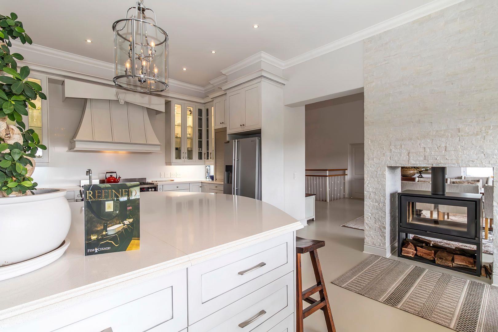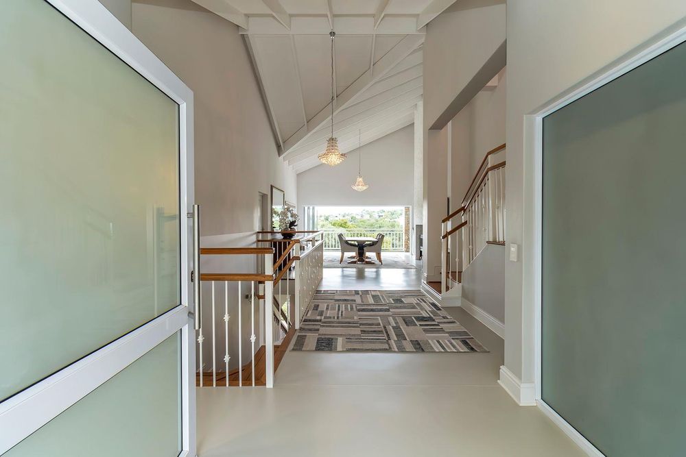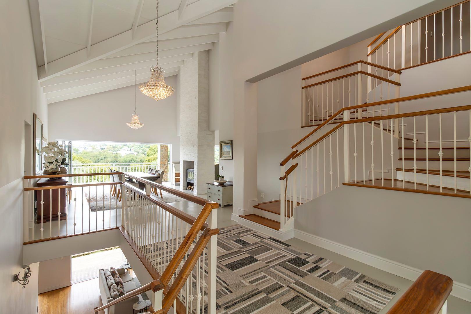 You are welcomed into the home through a stylish entrance hall where you are immediately greeted by the panoramic river views. This level accommodates the home office with a view, open plan designer kitchen, dining room and lounge with central double-sided feature fireplace. These spaces all flow through glass stacking doors onto a veranda from which a view of the river can be enjoyed. Continuing on this level is a separate scullery, walk-in pantry and separate laundry.
