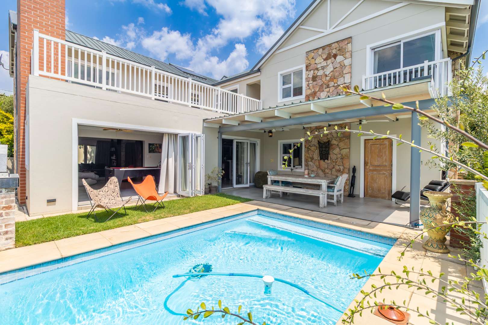 Stacking doors lead to a covered patio overlooking a sparkling swimming pool, firepit area, and built-in pizza oven, all surrounded by a beautifully landscaped garden with irrigation.