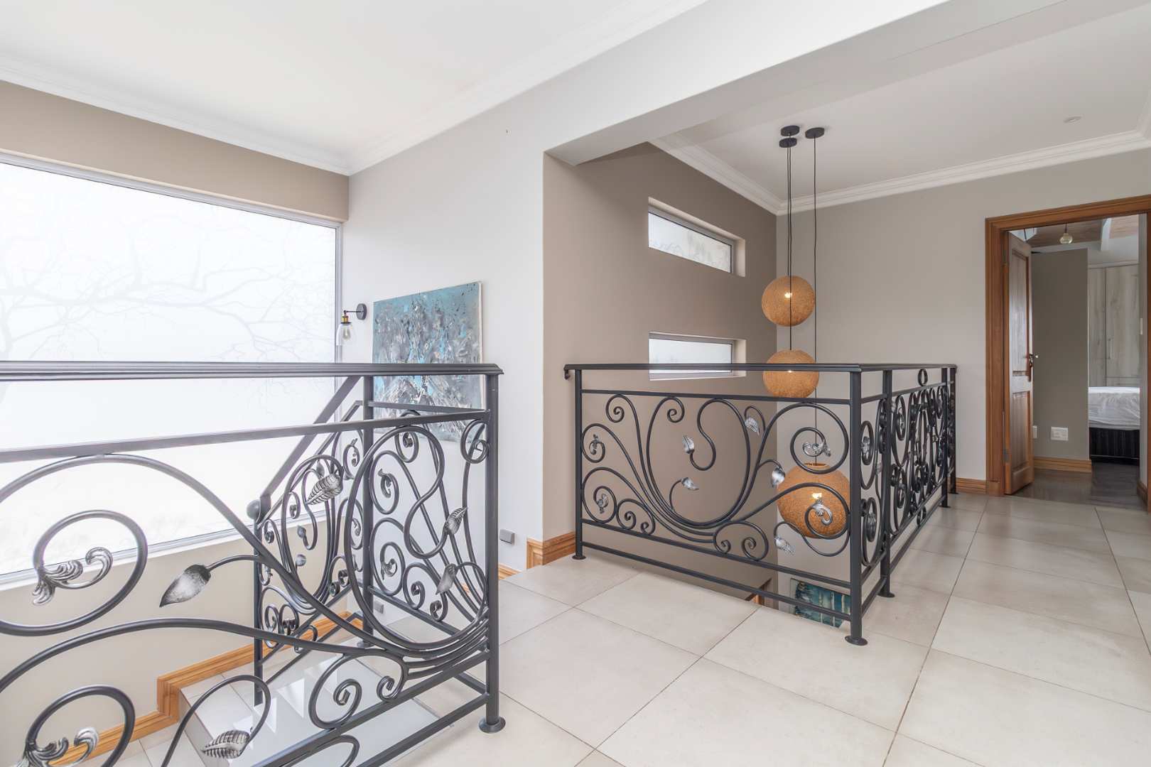 Upstairs offers a versatile pyjama lounge or study area on the landing, along with four well-sized bedrooms. The main suite boasts a dressing area, underfloor heating, air conditioning, a full en-suite bathroom, and a private balcony with lovely views. One additional full bathroom services the remaining bedrooms.