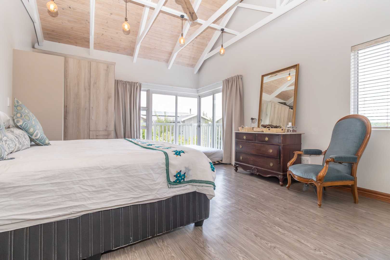 From the welcoming entrance hall, the home opens into expansive open-plan living areas that include a formal lounge complete with air conditioning, underfloor heating, and a Morso-style wood-burning fireplace. The adjoining dining room, contemporary built-in bar, and indoor-outdoor patio with gas braai create the perfect setting for entertaining year-round.
