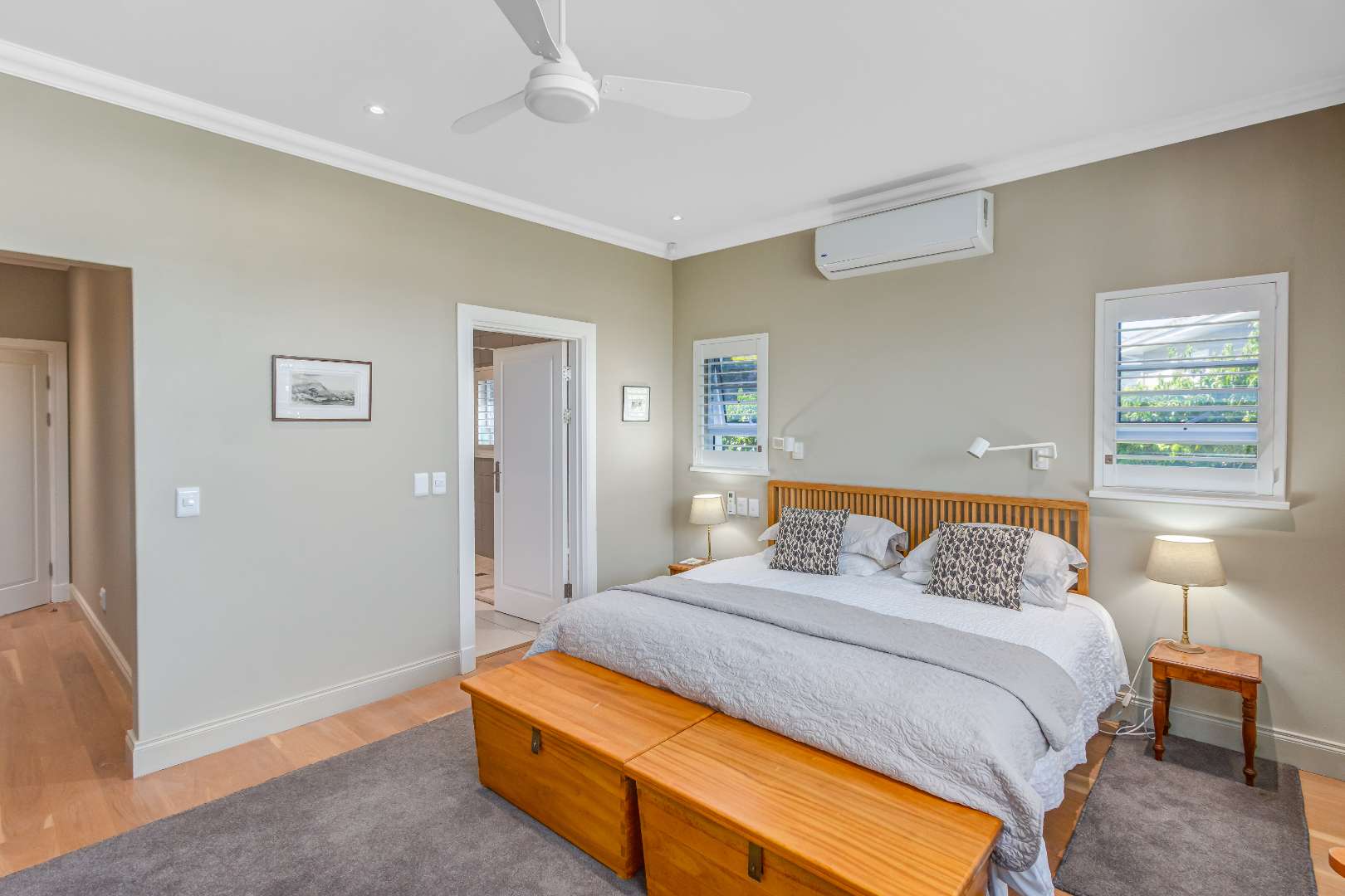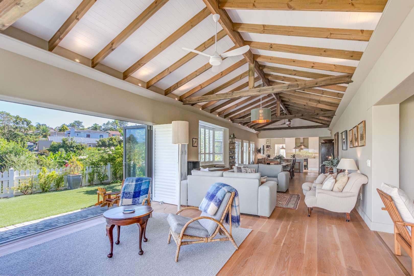 Solid white oak floors, high exposed beams and classic plantation shutters create a warm, timeless backdrop the kind of space that feels settled from the moment you walk in.