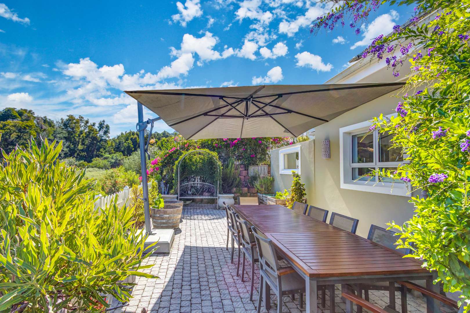 The modern kitchen with separate scullery flows easily into the living areas. At the far end, sliders open to reveal a quiet surprise: an enchanting English garden flanking a pathway that leads to a private alfresco setting with a ten-seater table. Beyond, an unspoilt forested hill rises, so synonymous with Knysna’s timber heritage. From a quiet corner in the opposite end of the garden, you have a view toward the estuary.