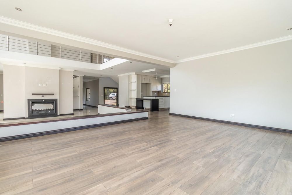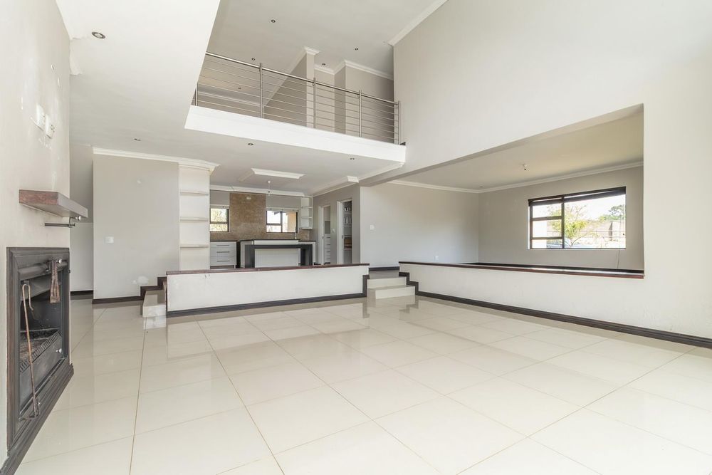 A double-volume entrance welcomes you into a split-level layout featuring open-plan living spaces, including a stylish kitchen with scullery, dining area, and lounge with a classic wood-burning fireplace.