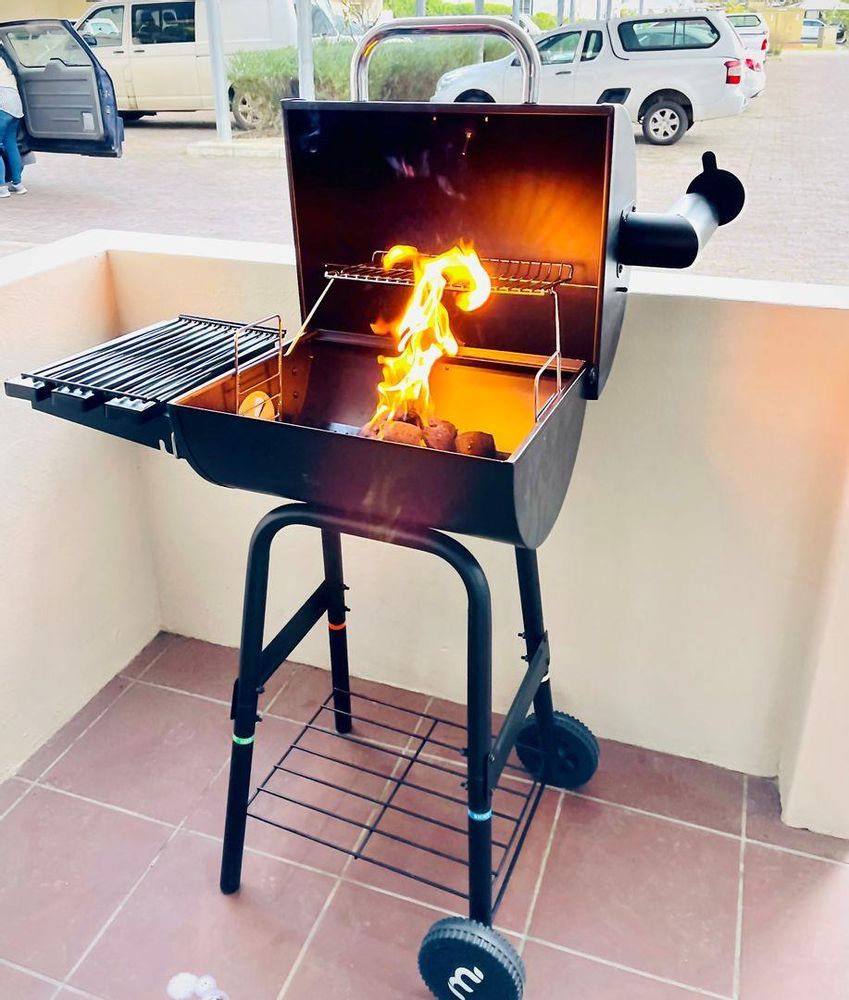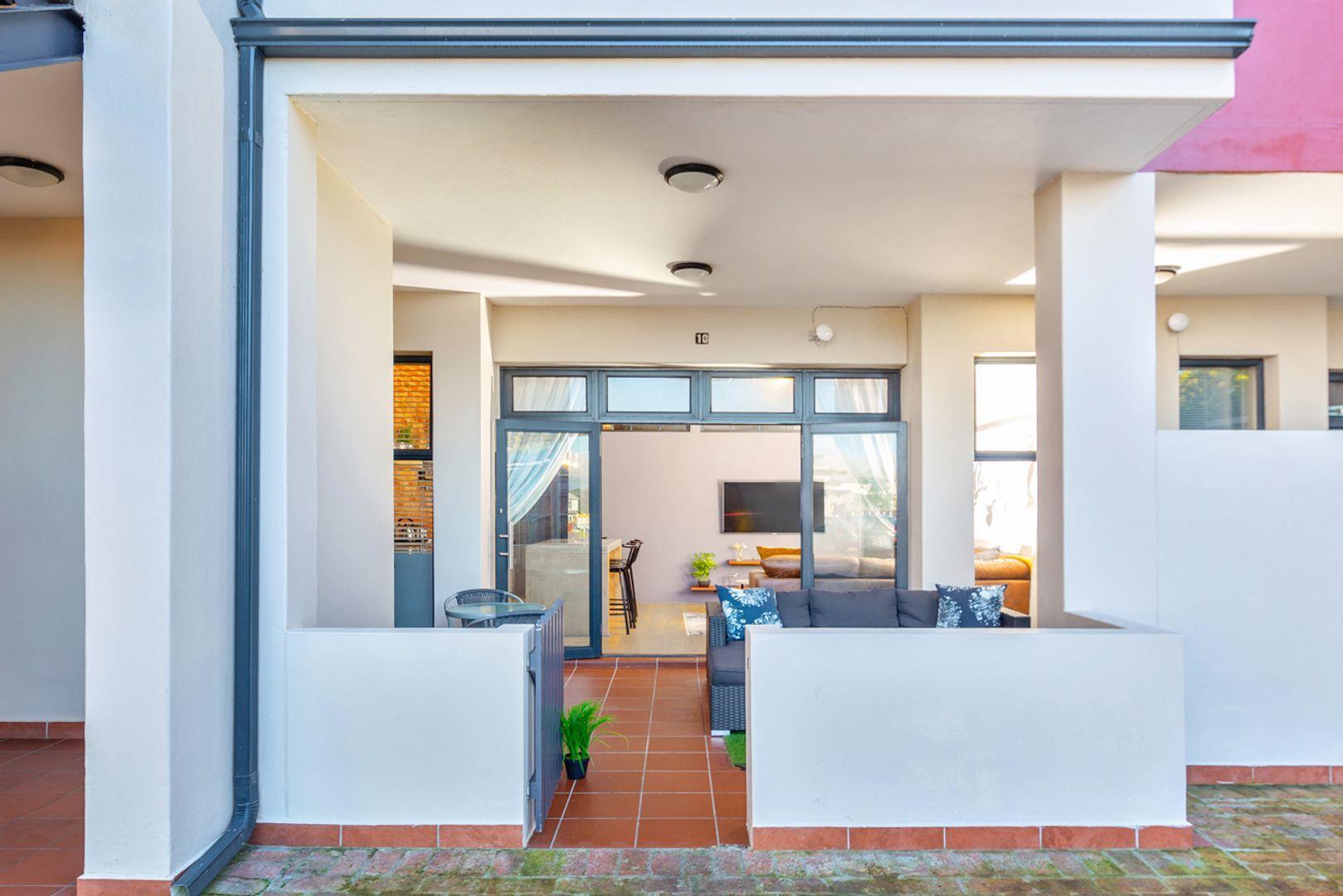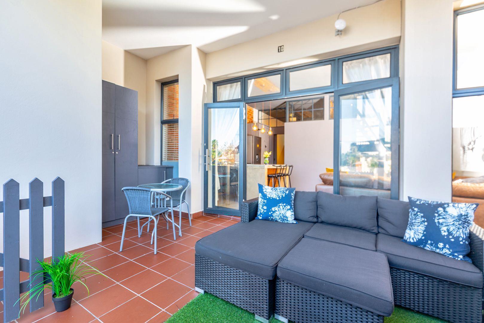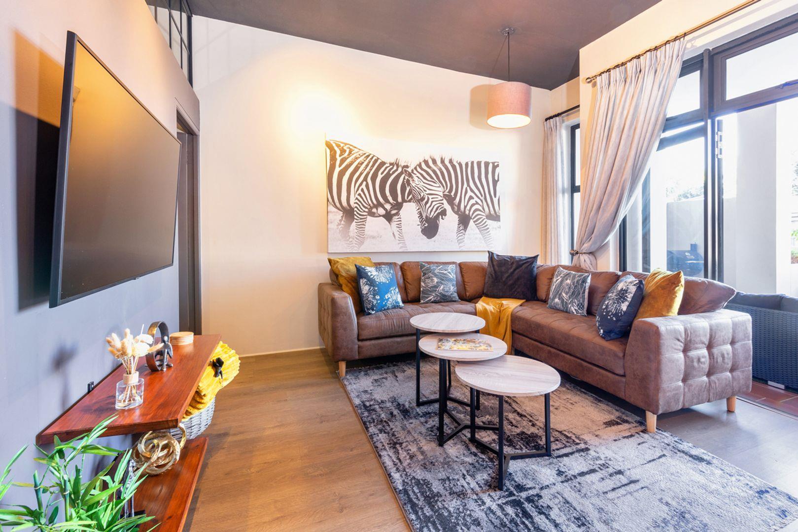 The lounge area with leather sofa provides relaxed and cosy seating with glass doors that open onto the patio as well as Megamaster braai stand and patio seating for 4/6 people.