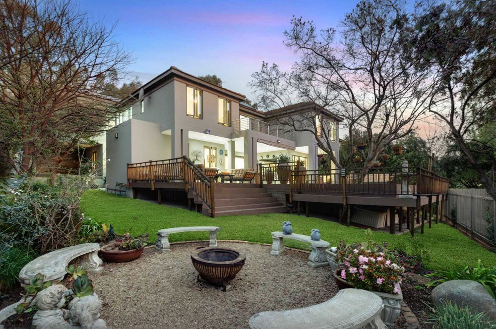 The landscaped garden contains a firepit and fully automated sprinkler system.