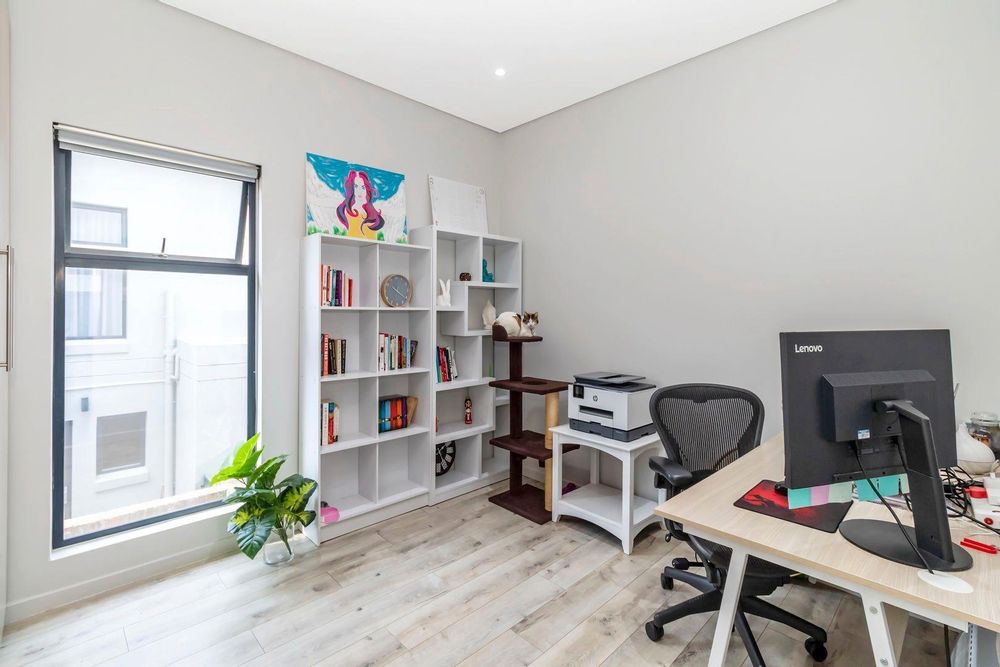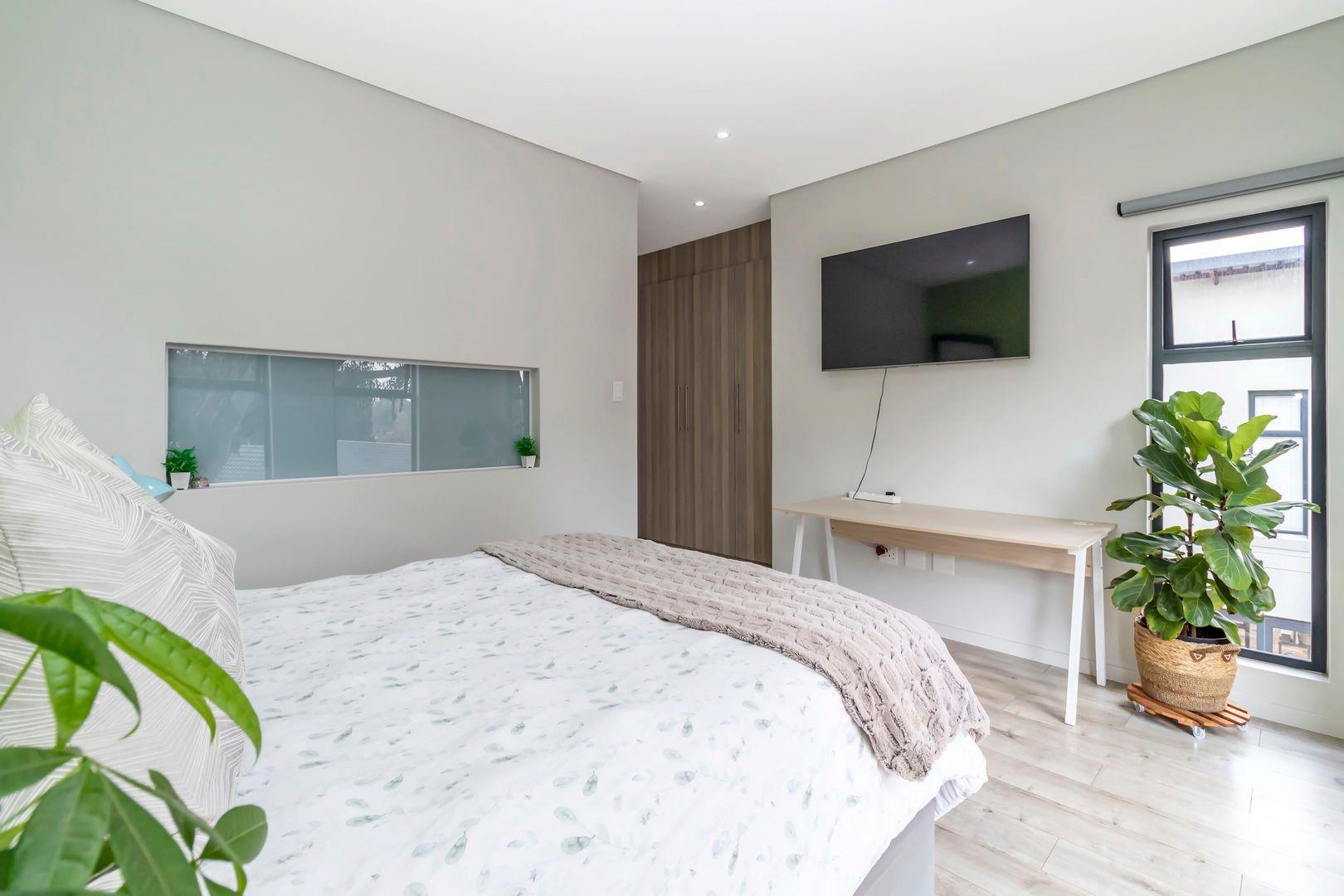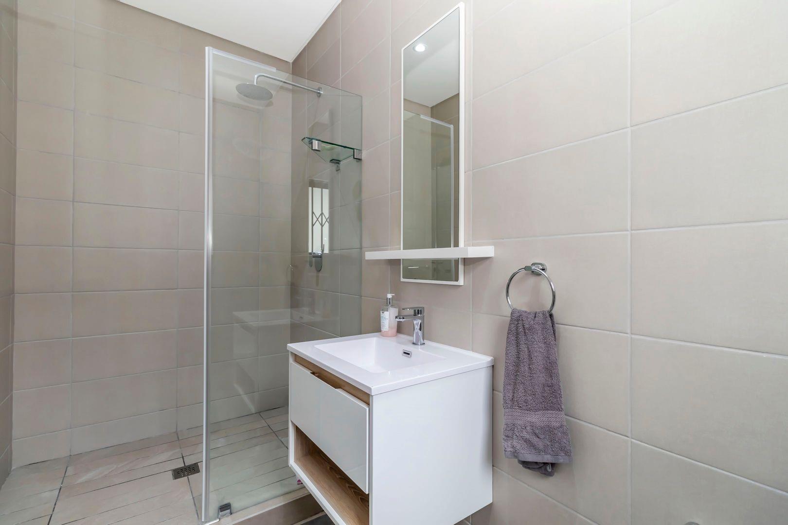The industrial staircase leads to the first floor which accommodates four bedrooms, with three bathrooms ( two en suite) The master bedroom includes fabulous cupboard space, large modern full bathroom with double vanity and a peaceful north facing bedroom where the large trees creates a lovely picture.