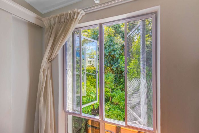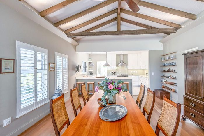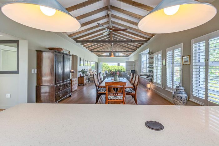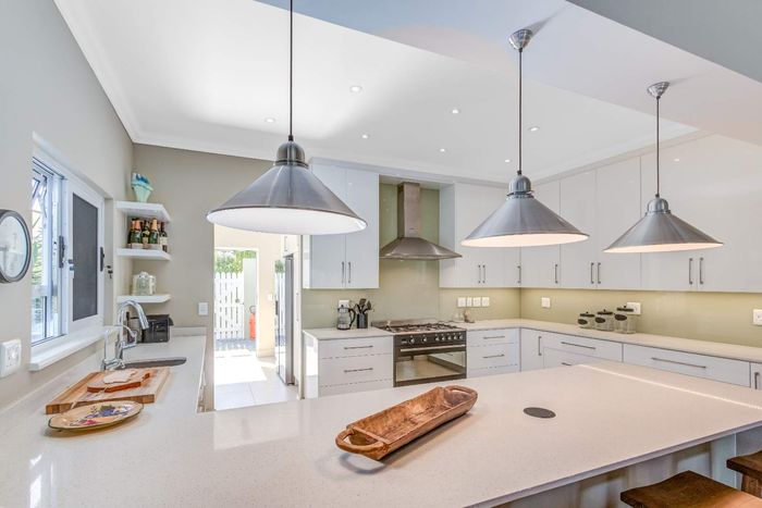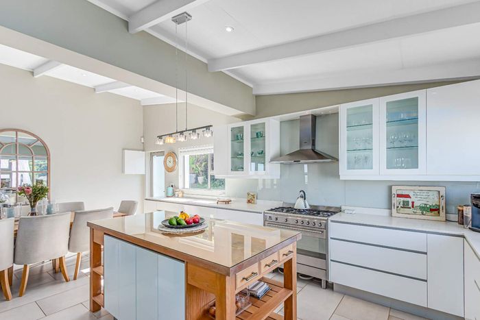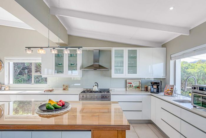 Elevated Amble Ridge retreat offering secure, relaxed Knysna living, with a secluded English garden leading to a private alfresco ten-seater — modern kitchen and three-bedroom accommodation.