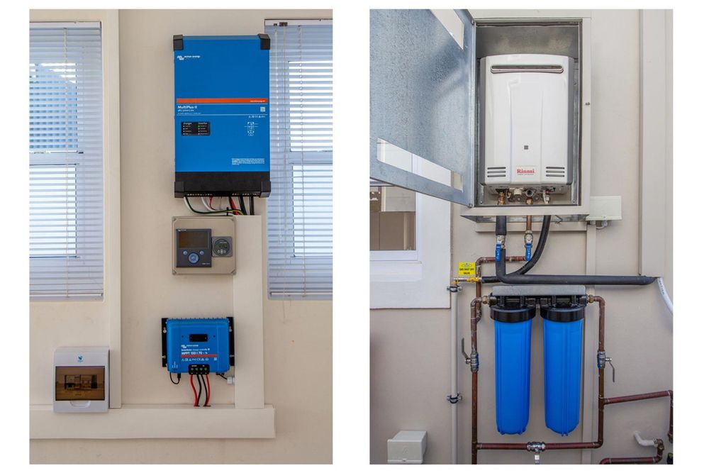 Solar panels with inverter and battery backup for electricity reserves during rolling blackouts. Gas water heating system to ensure warm 24/7.