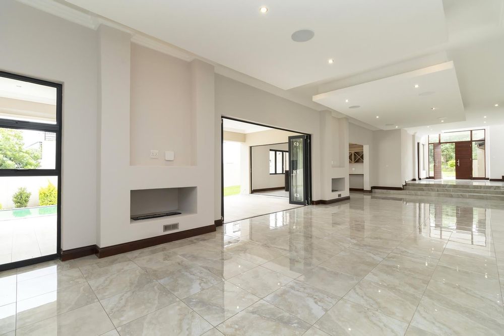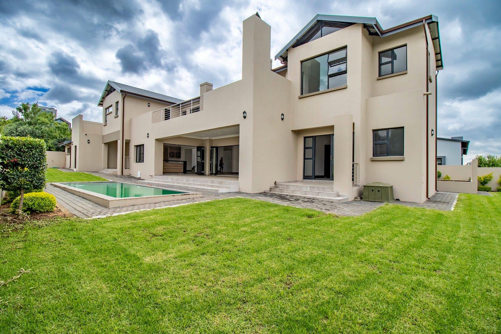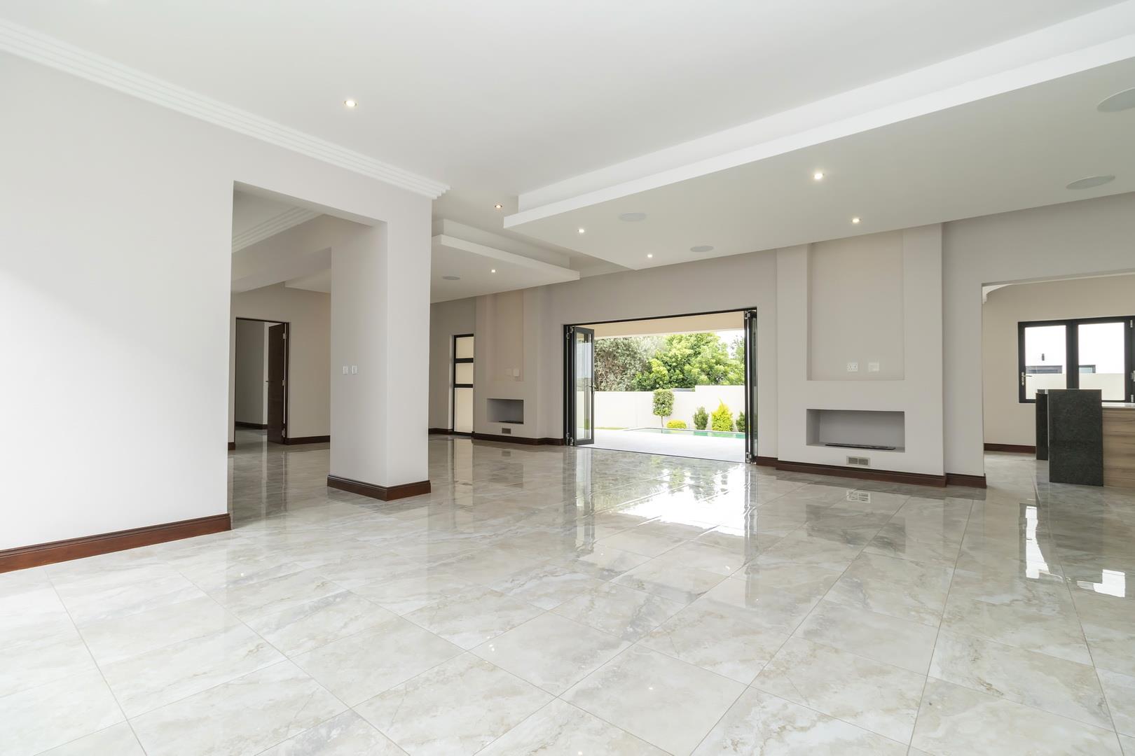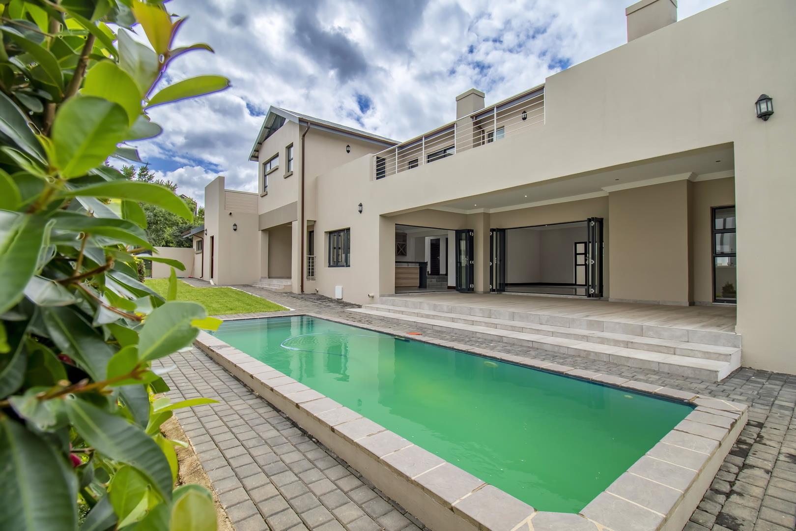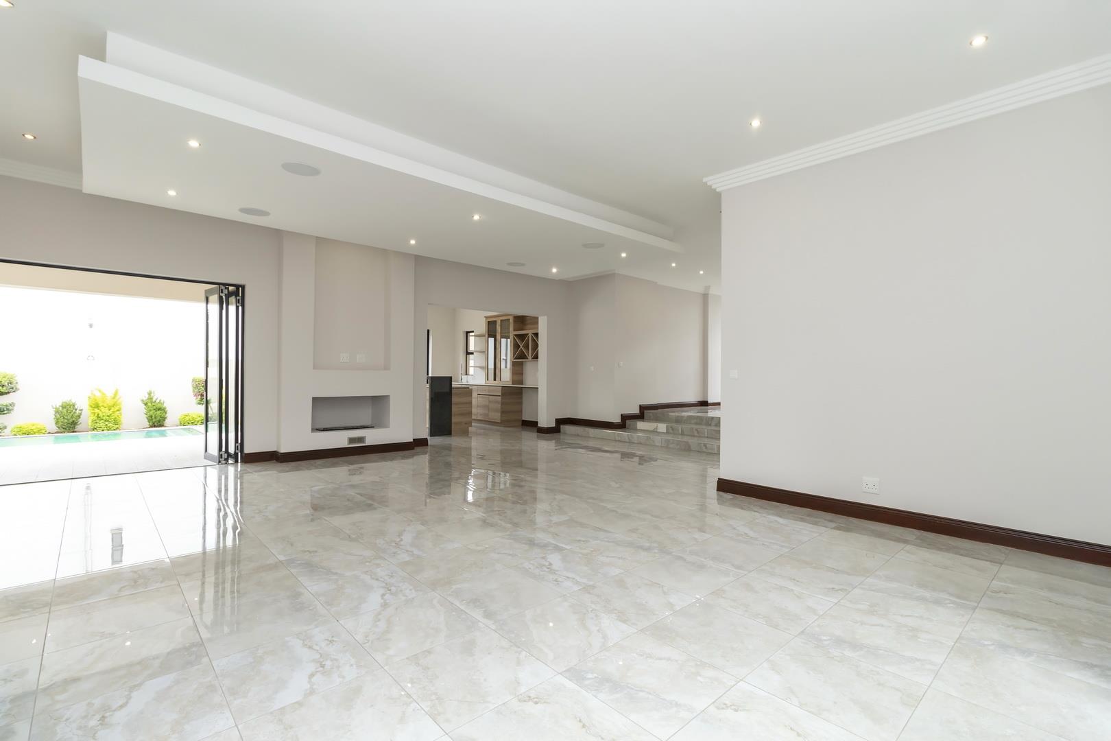 The principal floor, open plan living area allows for glamorous formal entertaining or a relaxed luxurious informal setting. The gourmet kitchen, complete with integrated appliances, is an integral feature as well as the open plan formal lounge and dining room with own gas fireplace. This area is further enhanced when the tall stacker doors are opened onto the garden, swimming pool, boma, covered patio and built in braais. The remaining living spaces include a guest cloak room and an en-suite guest bedroom, a study and a built-in bar.