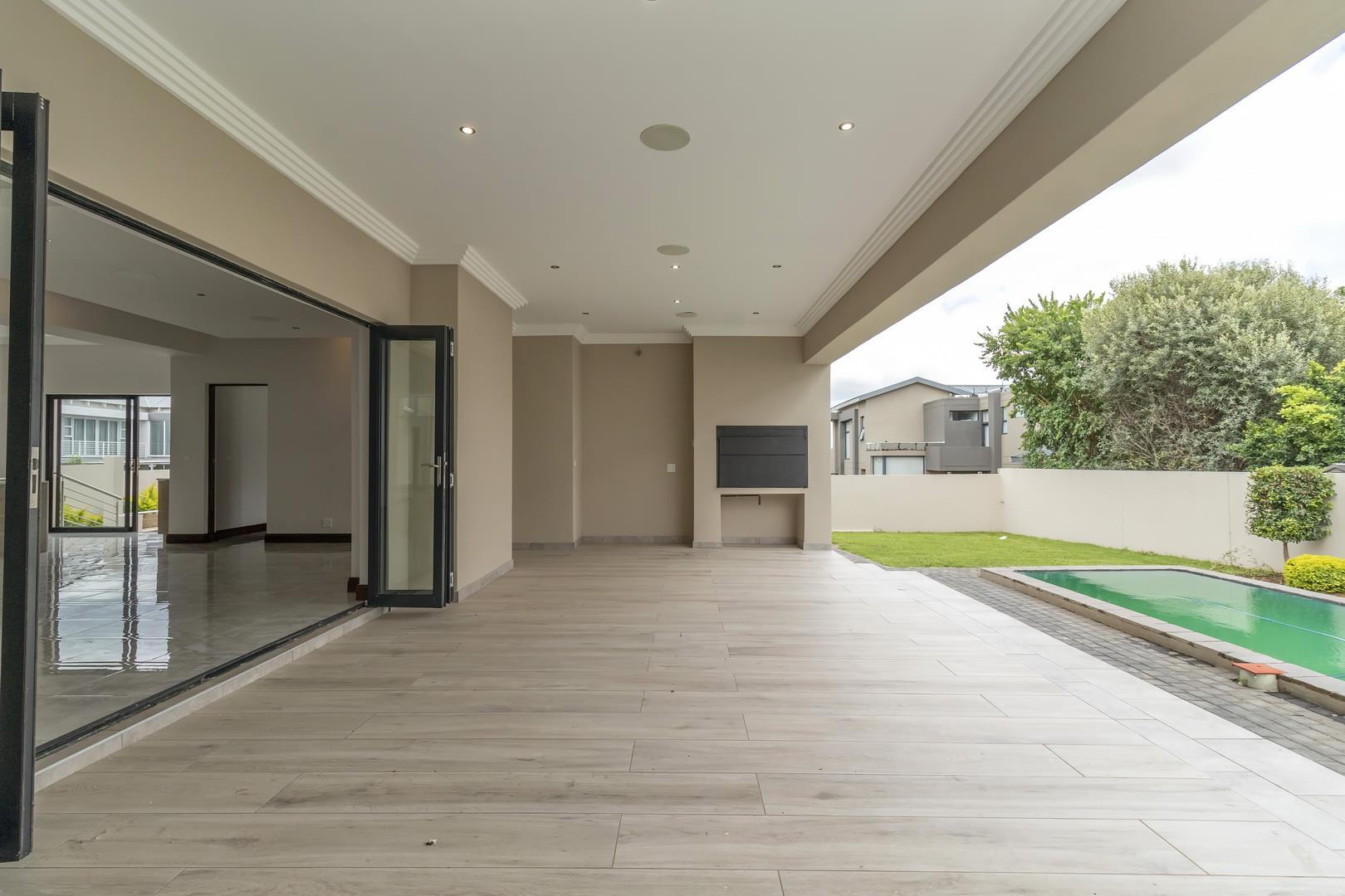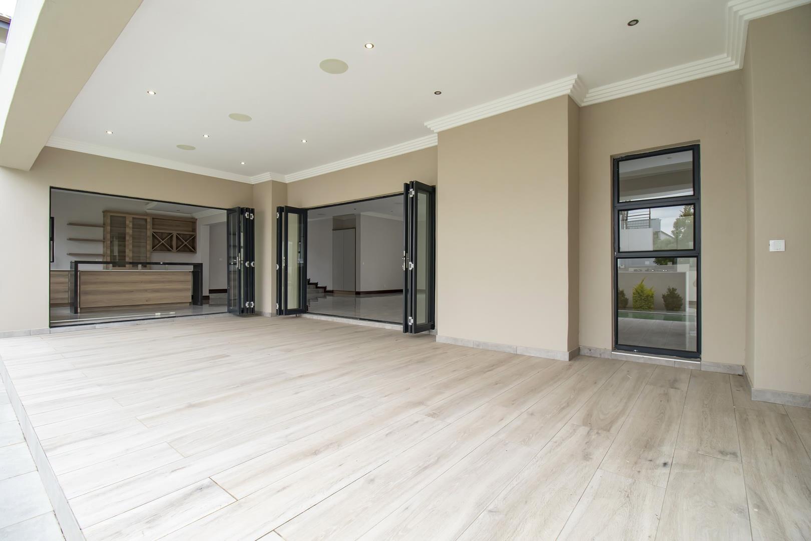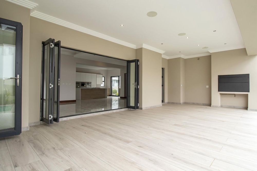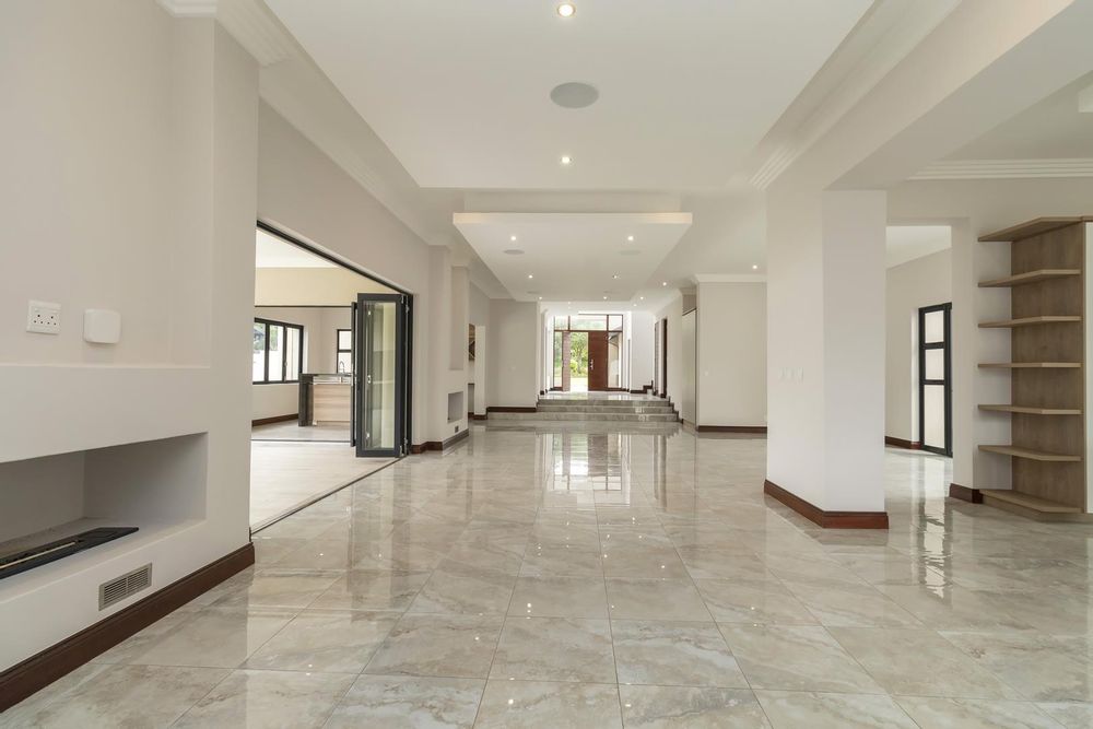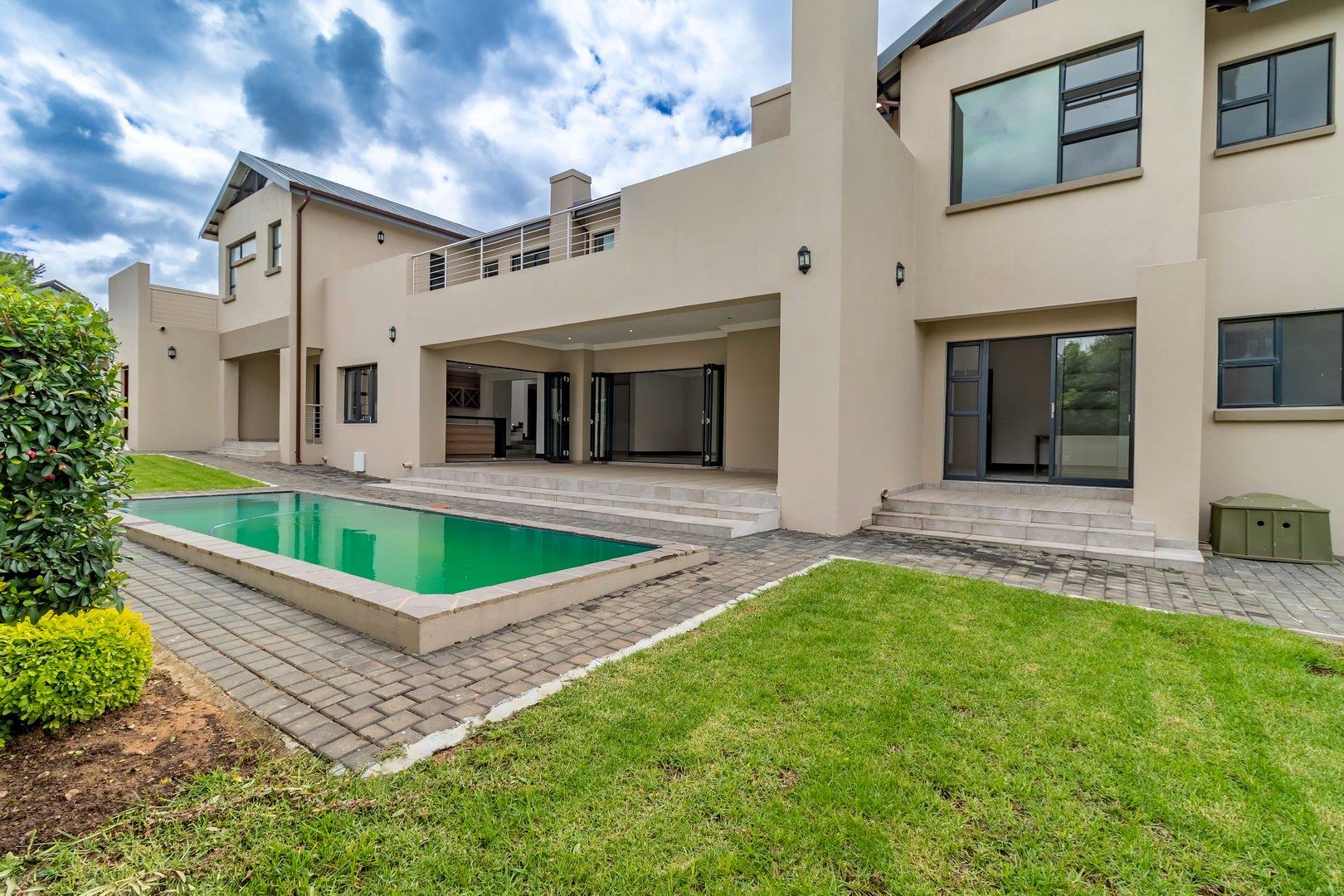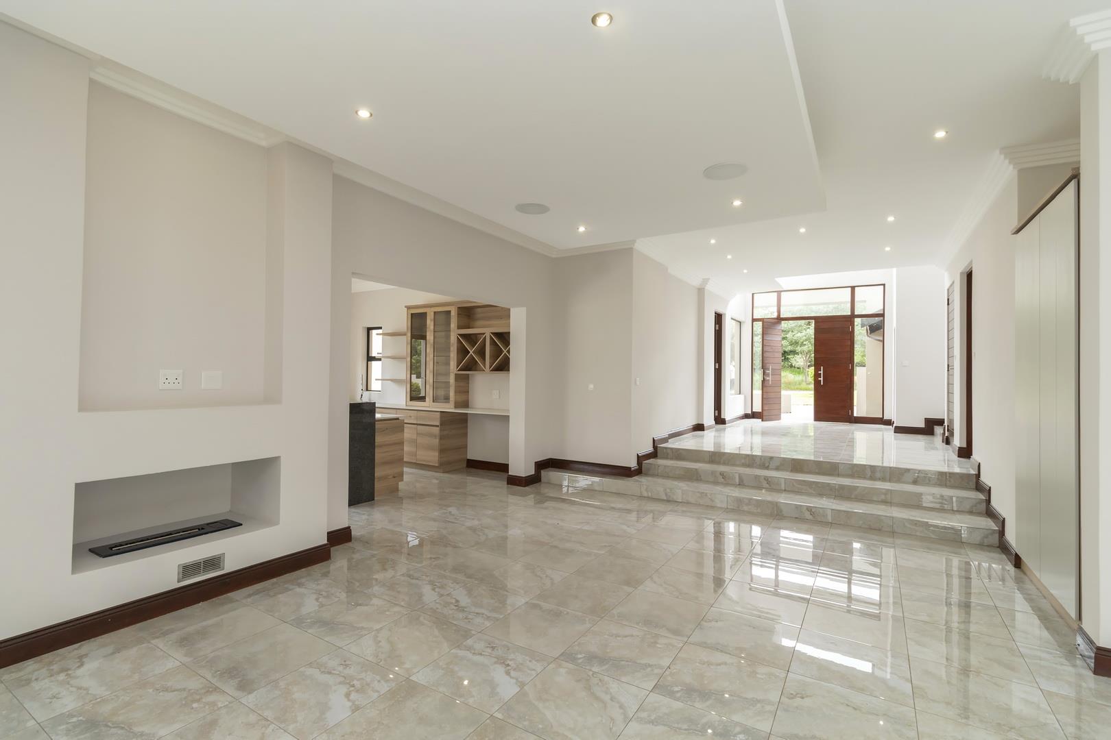 The principal floor, open plan living area allows for glamorous formal entertaining or a relaxed luxurious informal setting. The gourmet kitchen, complete with integrated appliances, is an integral feature as well as the open plan formal lounge and dining room with own gas fireplace. This area is further enhanced when the tall stacker doors are opened onto the garden, swimming pool, boma, covered patio and built in braais. The remaining living spaces include a guest cloak room and an en-suite guest bedroom, a study and a built-in bar.