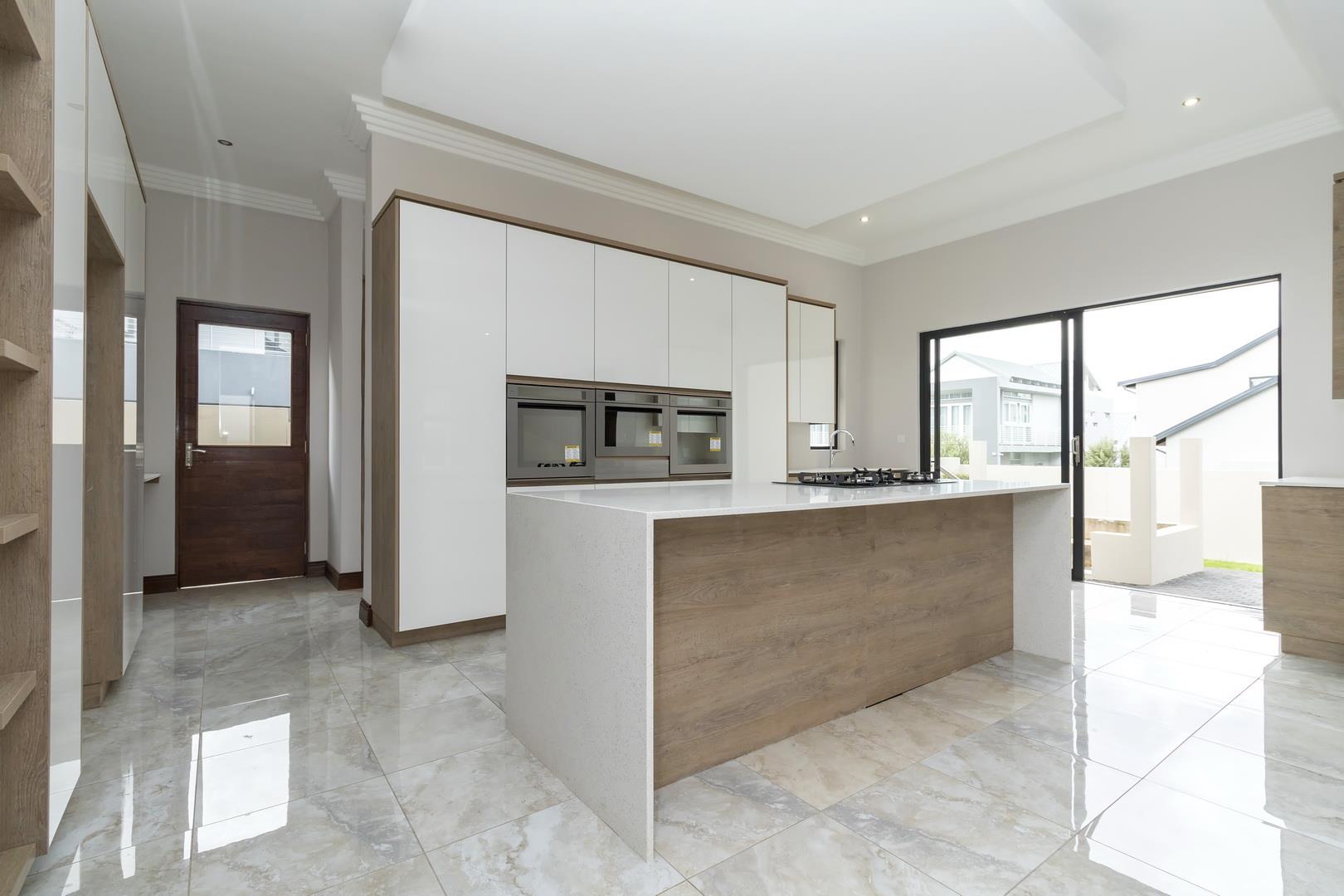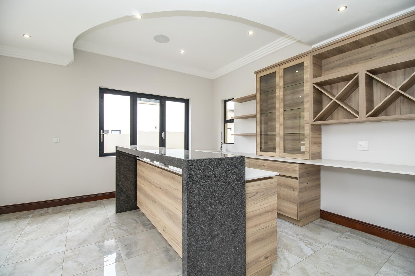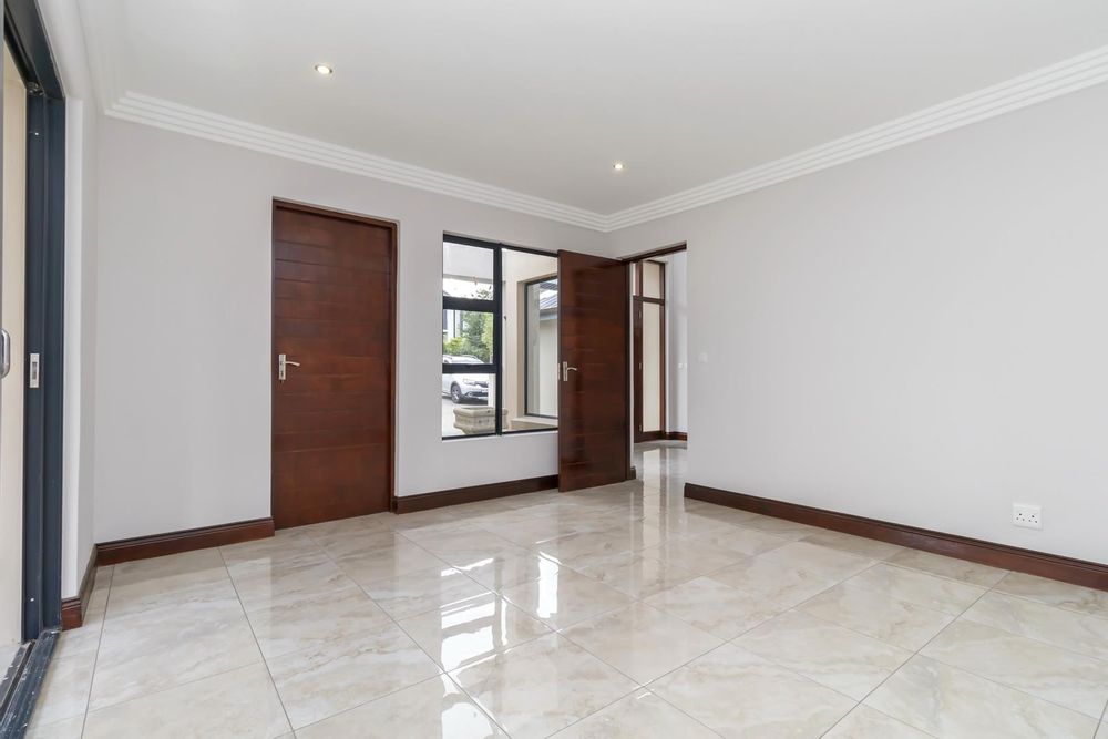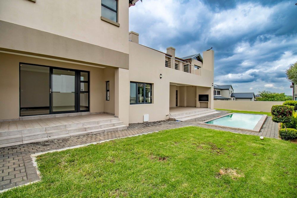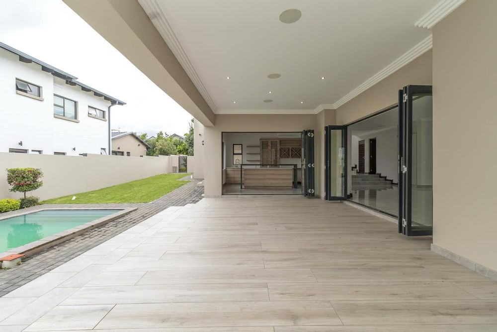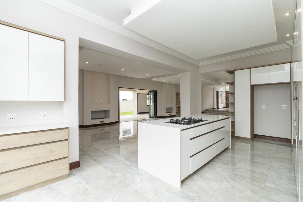The principal floor, open plan living area allows for glamorous formal entertaining or a relaxed luxurious informal setting. The gourmet kitchen, complete with integrated appliances, is an integral feature as well as the open plan formal lounge and dining room with own gas fireplace. This area is further enhanced when the tall stacker doors are opened onto the garden, swimming pool, boma, covered patio and built in braais. The remaining living spaces include a guest cloak room and an en-suite guest bedroom, a study and a built-in bar.