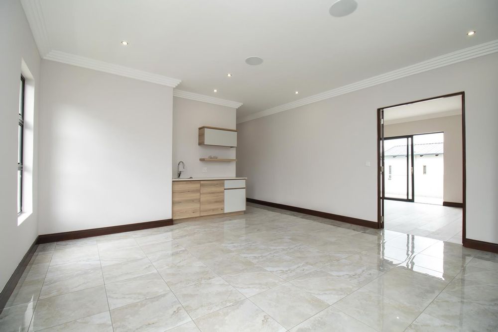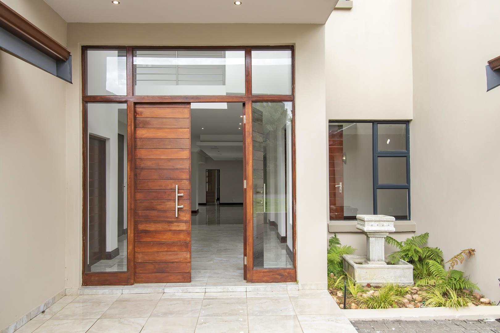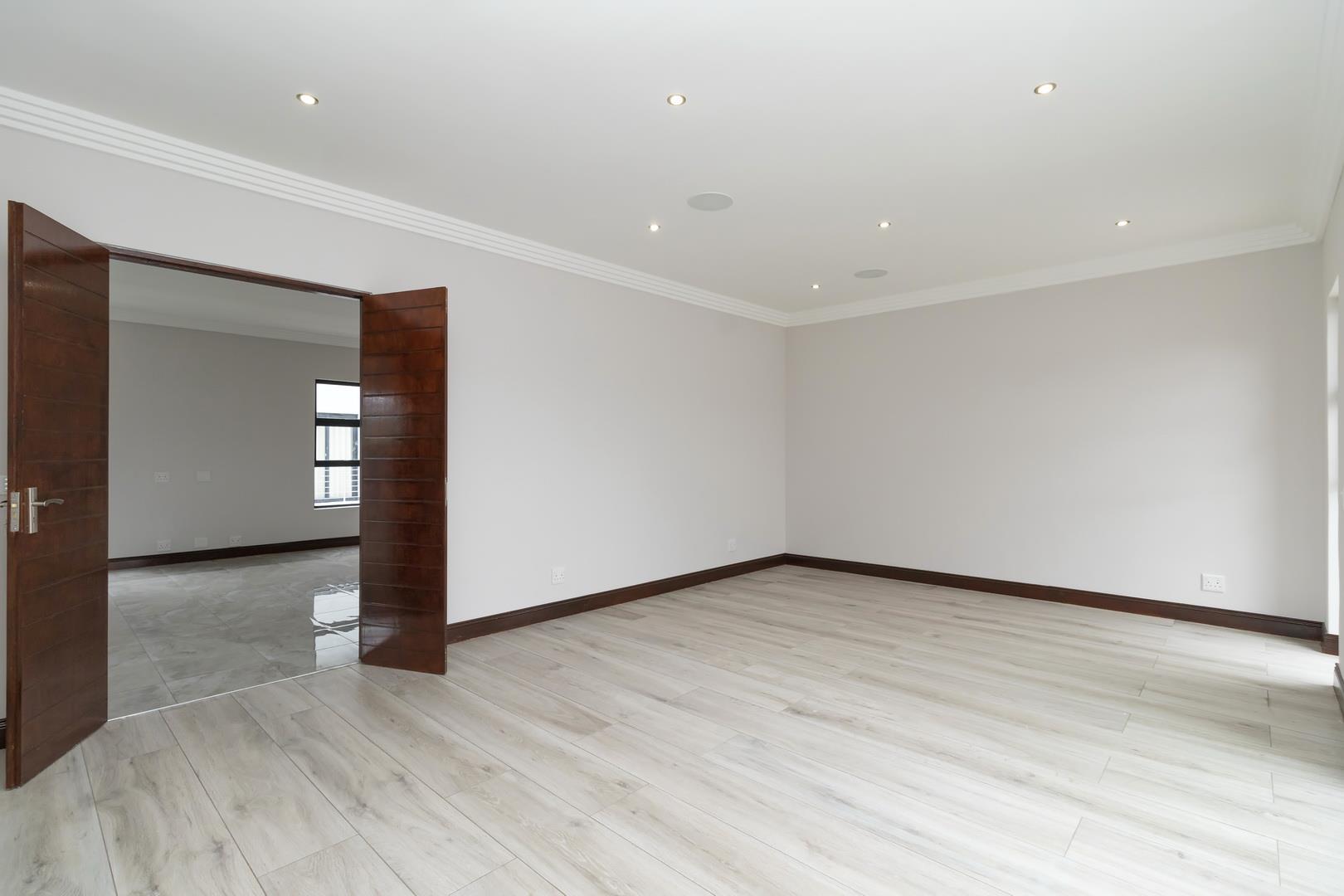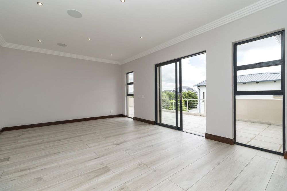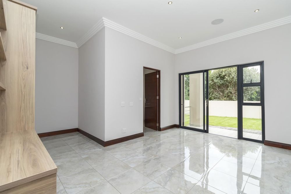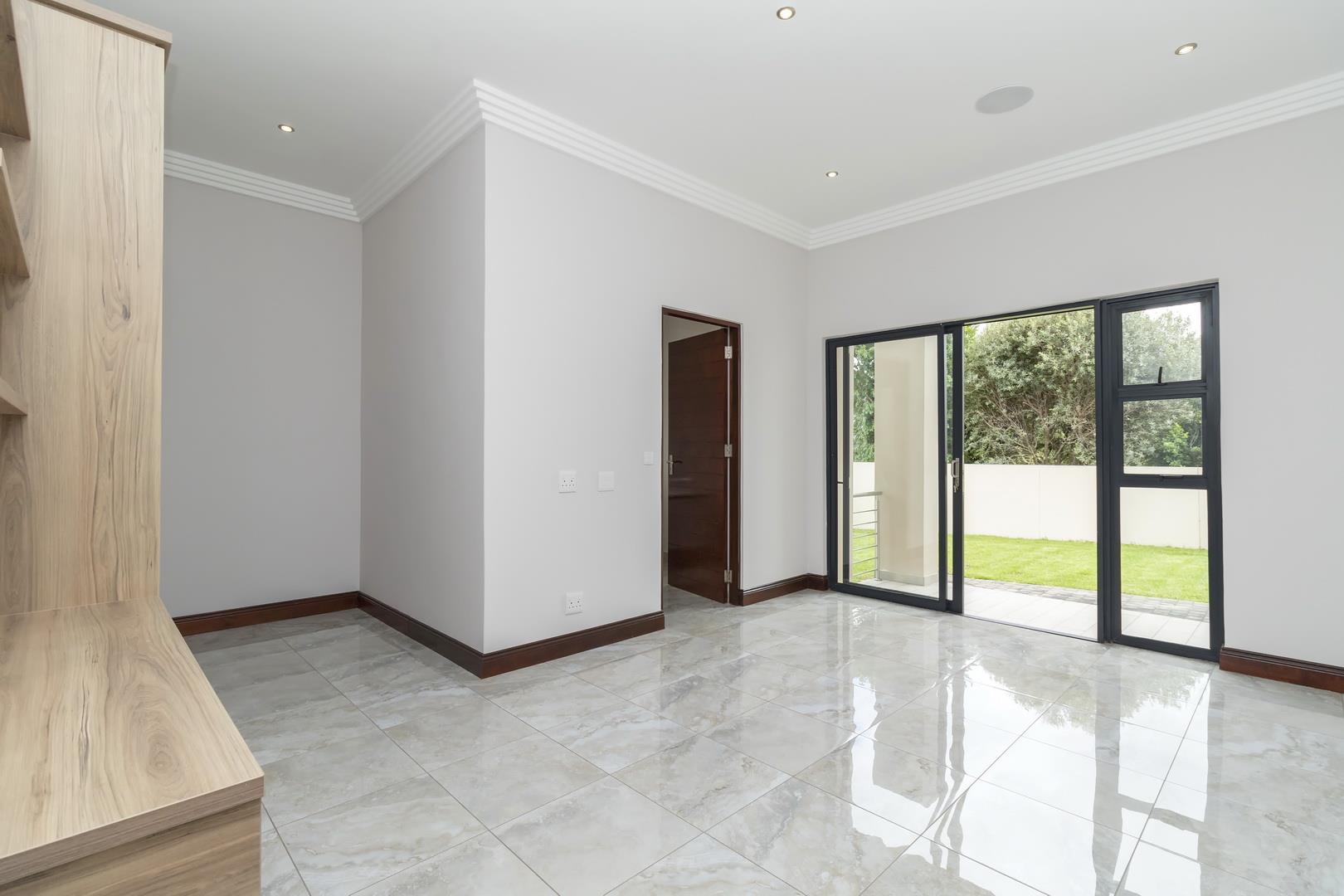 The principal floor, open plan living area allows for glamorous formal entertaining or a relaxed luxurious informal setting. The gourmet kitchen, complete with integrated appliances, is an integral feature as well as the open plan formal lounge and dining room with own gas fireplace. This area is further enhanced when the tall stacker doors are opened onto the garden, swimming pool, boma, covered patio and built in braais. The remaining living spaces include a guest cloak room and an en-suite guest bedroom, a study and a built-in bar.