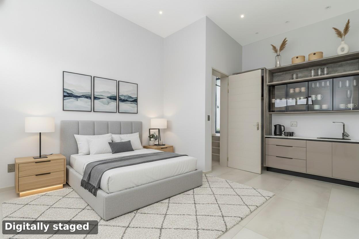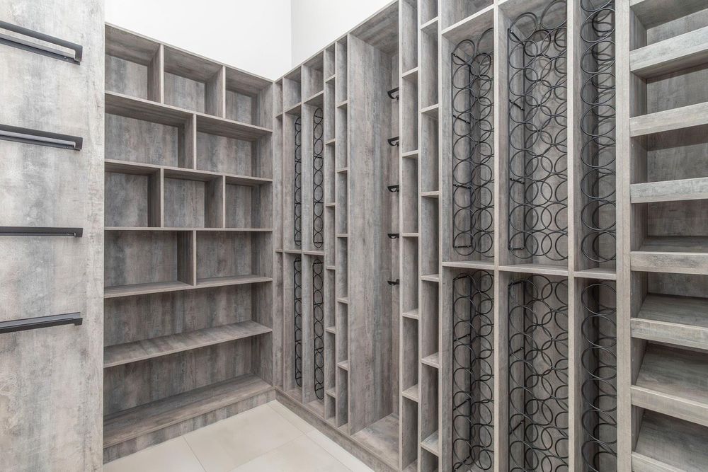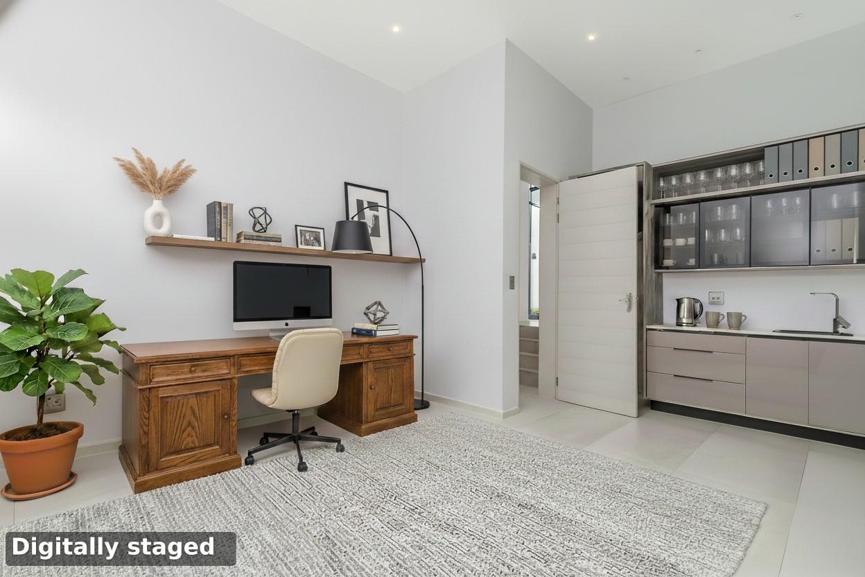 The west wing of the home offers a private guest en-suite bedroom and a fully equipped cinema room. Completing the ground floor is a striking custom wine wall, a versatile gym or children’s playroom, and a dedicated study.