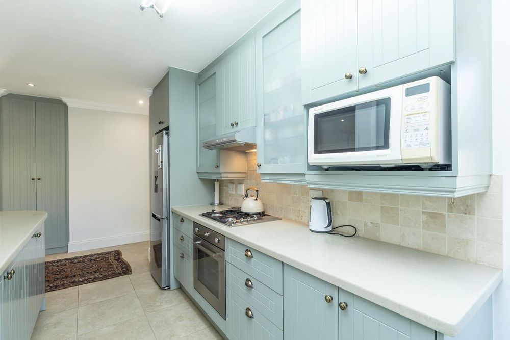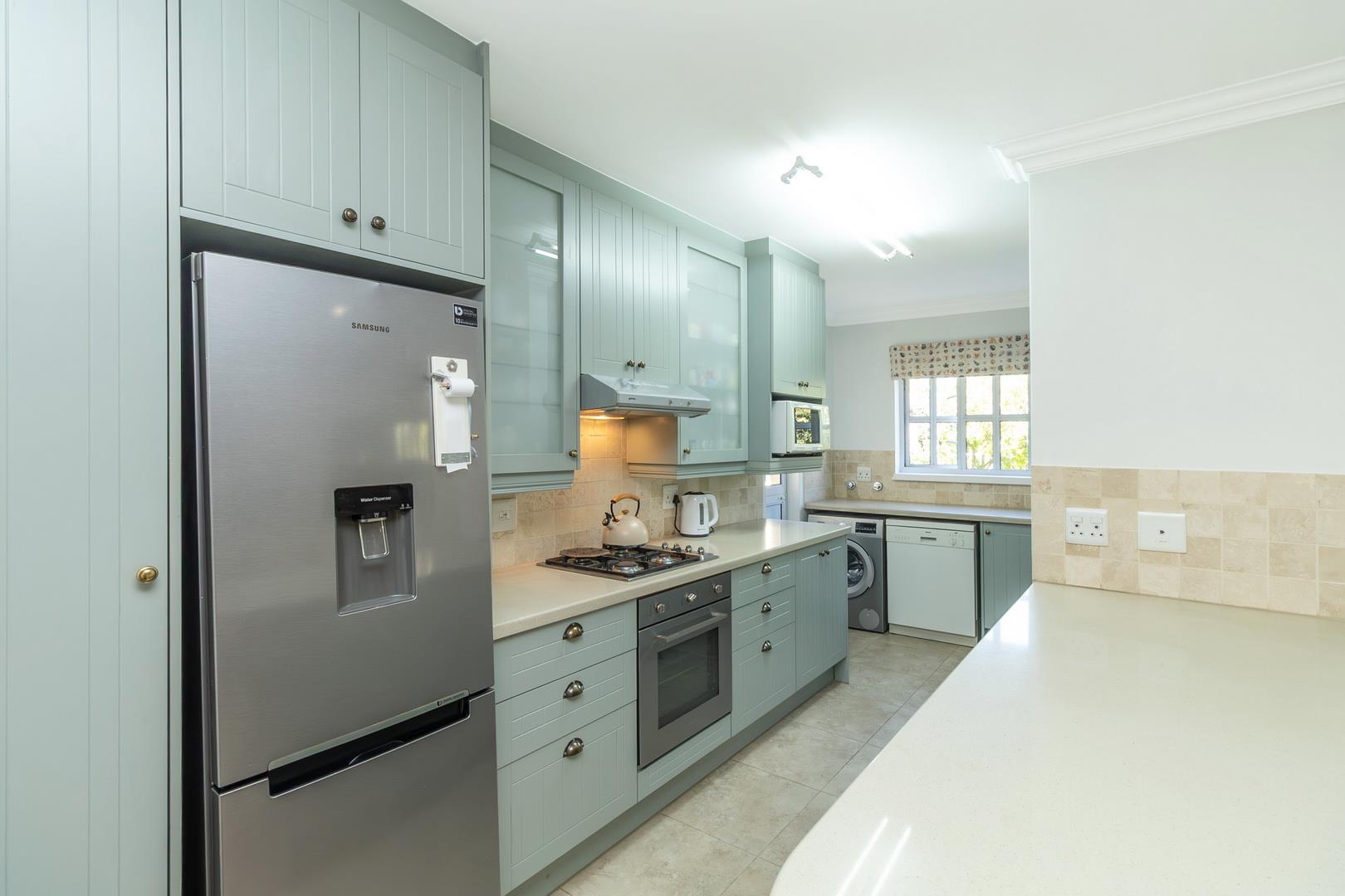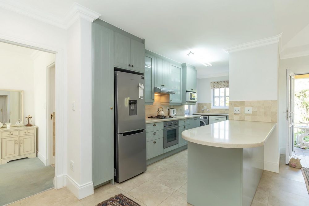 The inviting farmhouse-style kitchen features well-appointed cabinetry and countertops, with a gas hob and can accommodate a fridge and two appliances, ensuring every day functionality.